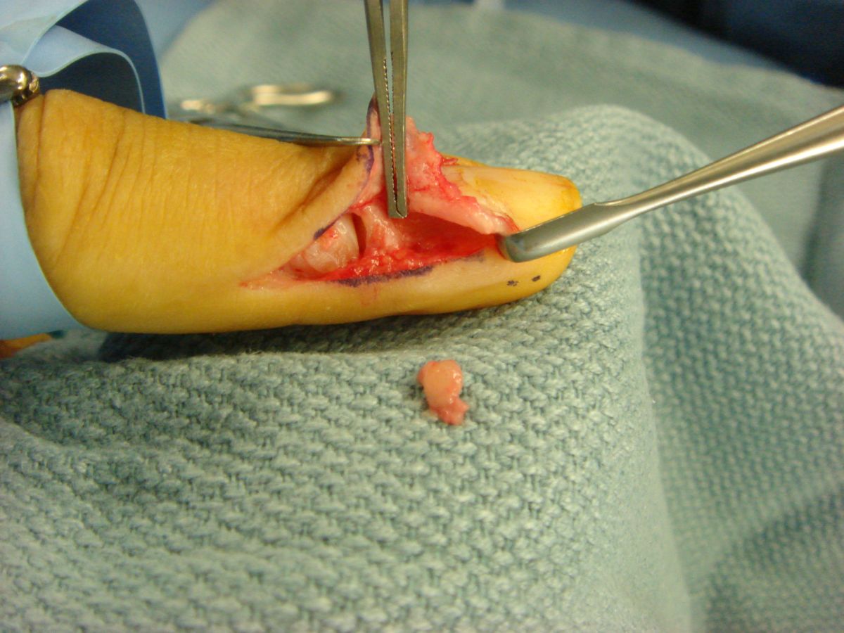 the matrix and the bone. They may be excised by splitting the nail bed,