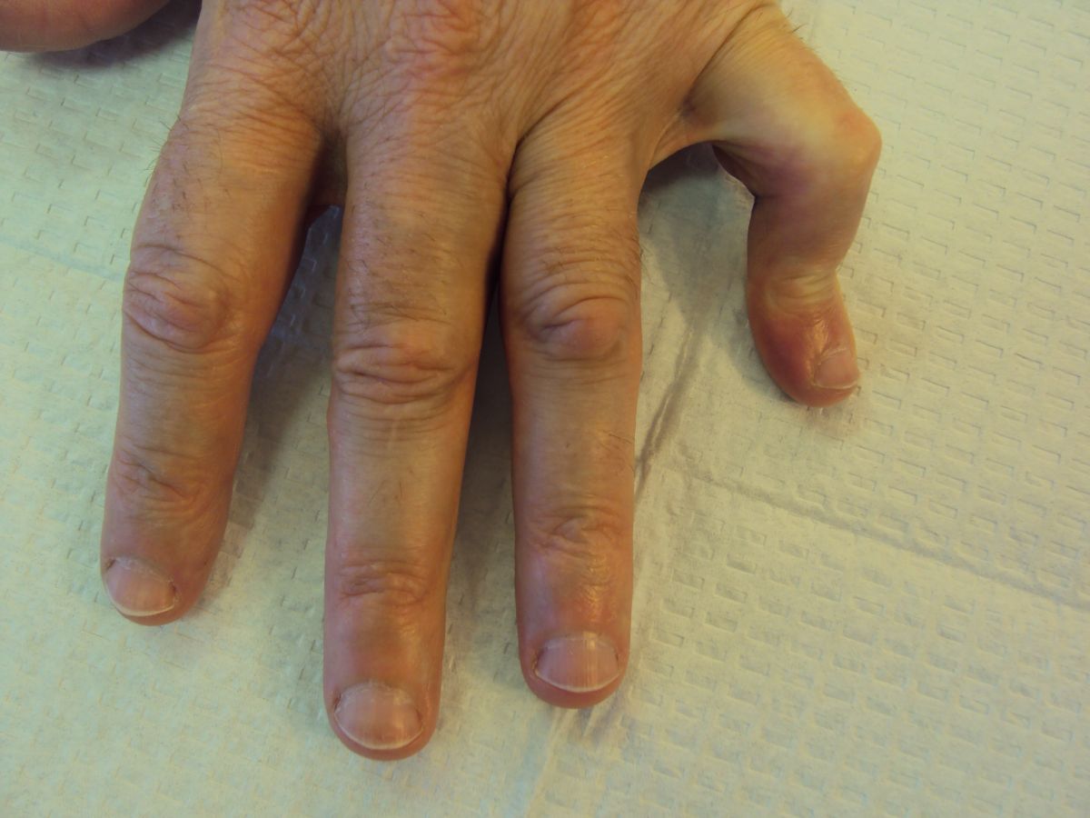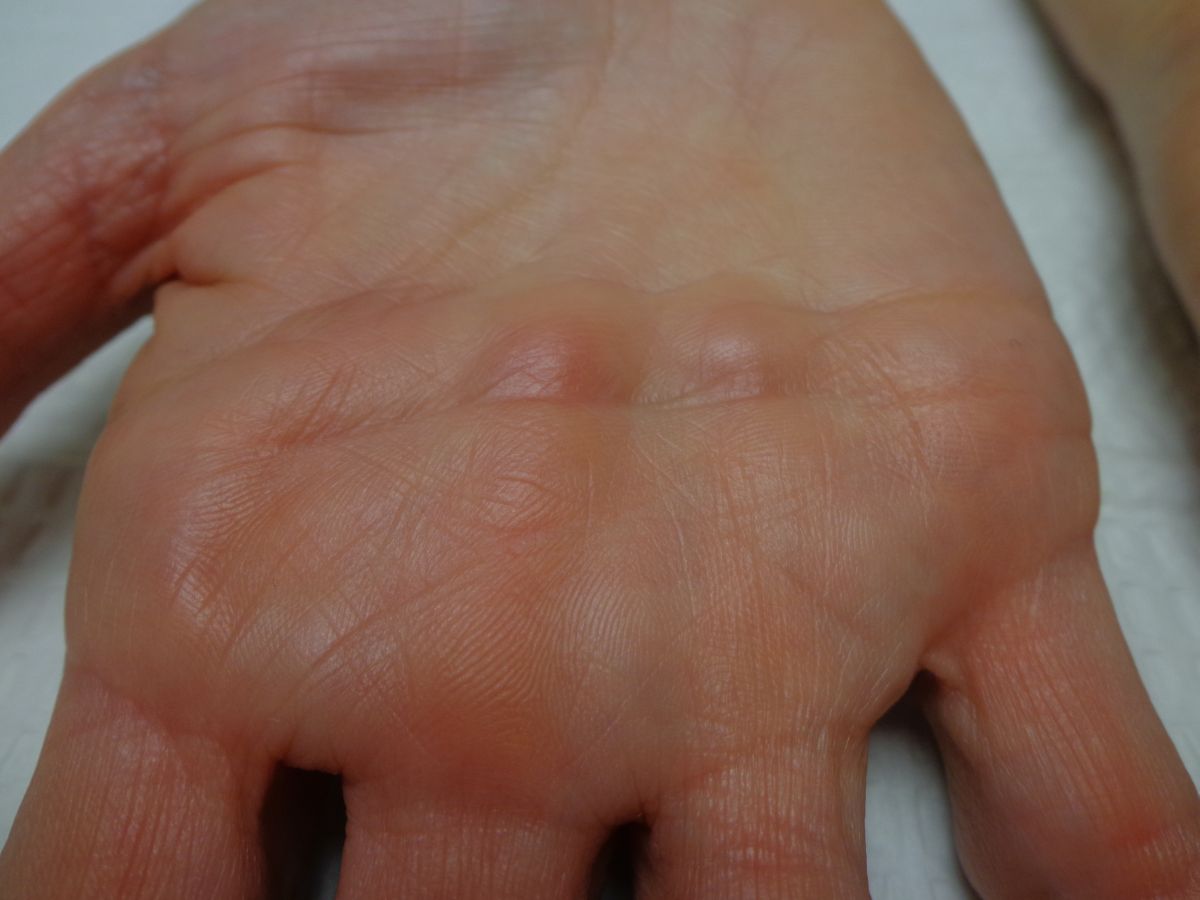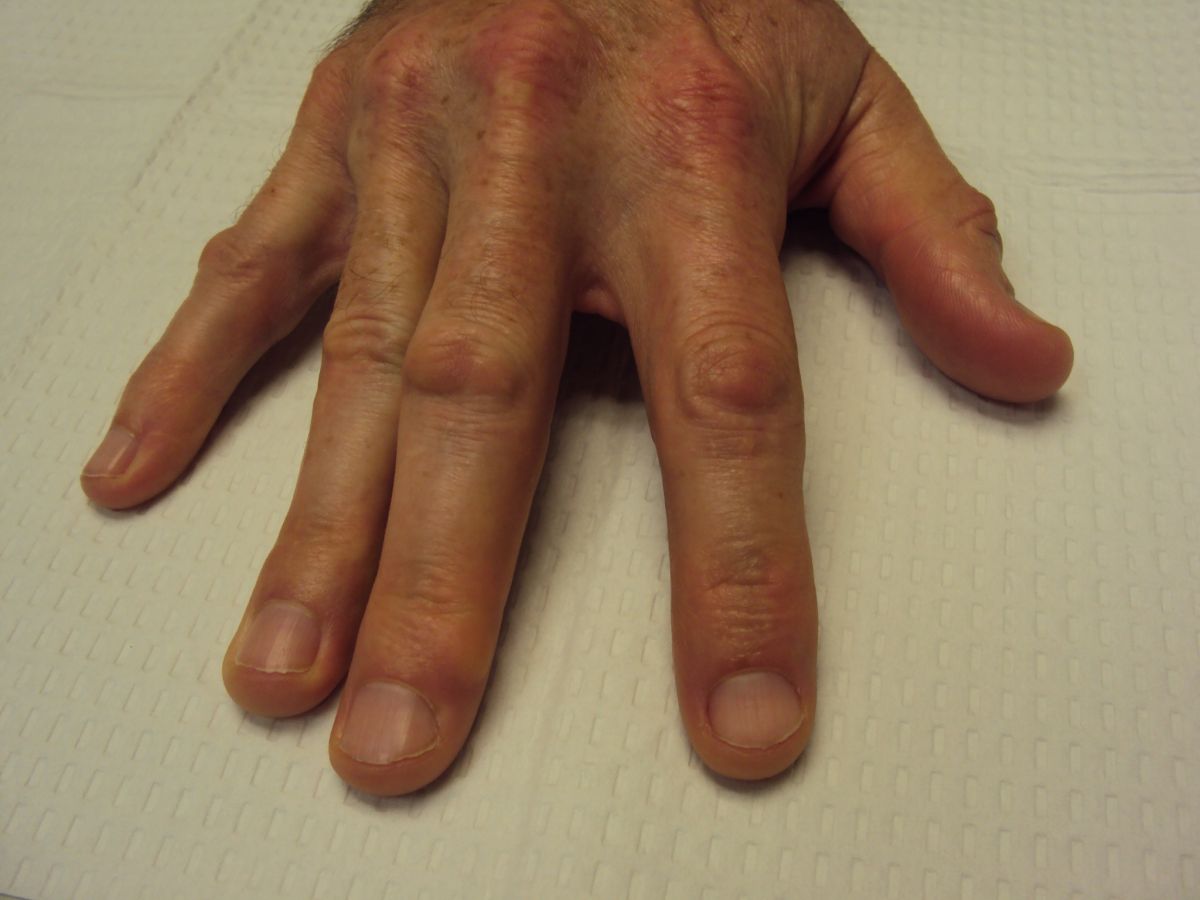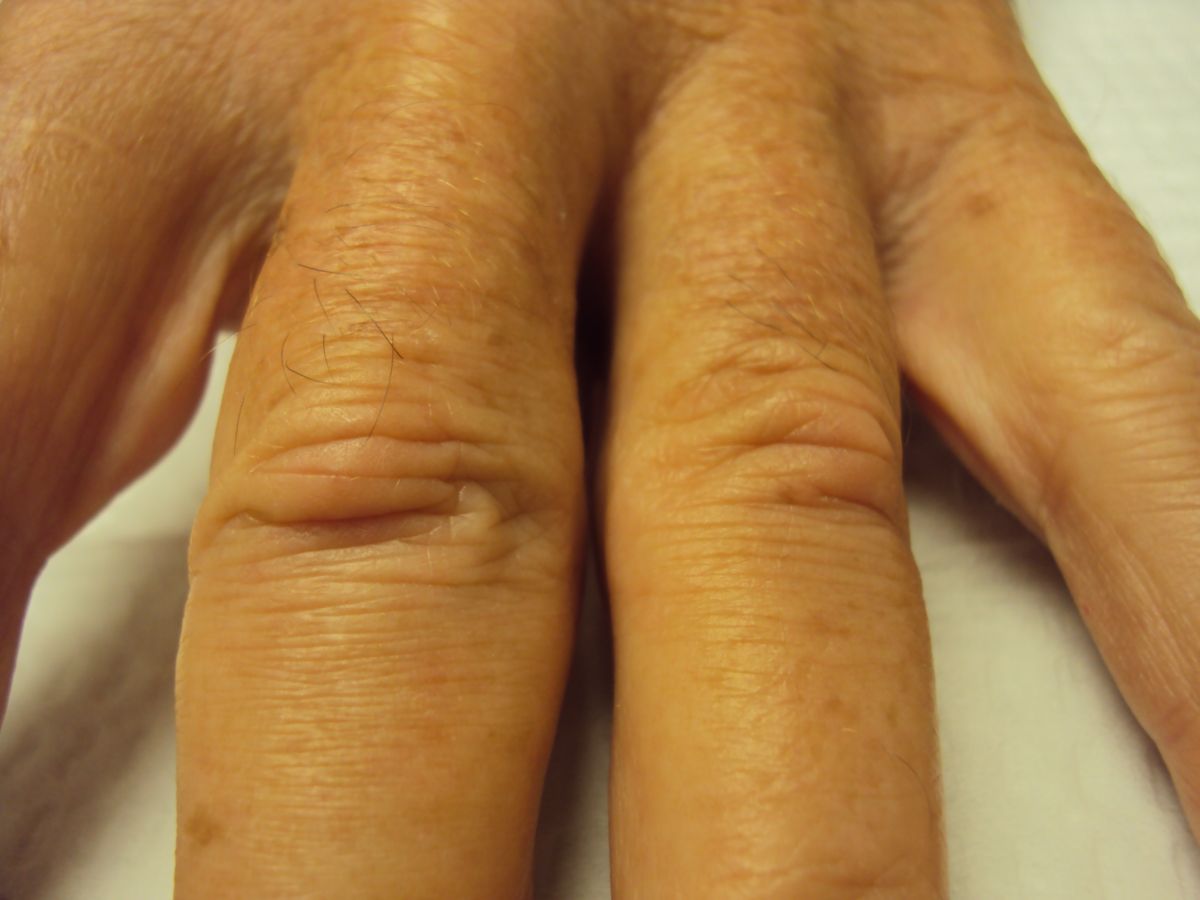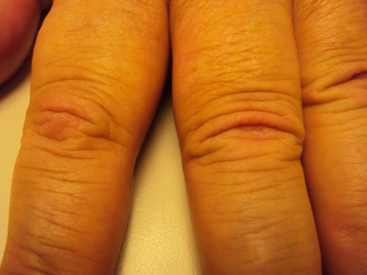| Typical appearing knuckle pads on the middle and ring finger PIP joints of this 38 year old man. He has no evidence of Dupuytren's disease. |