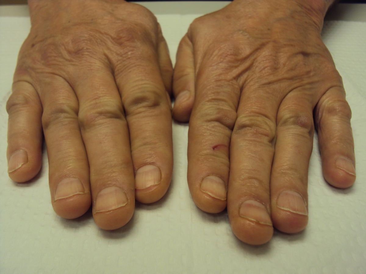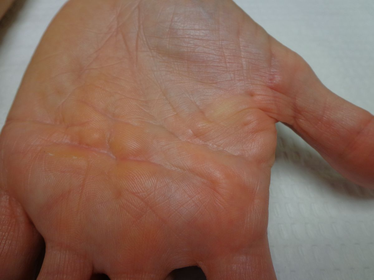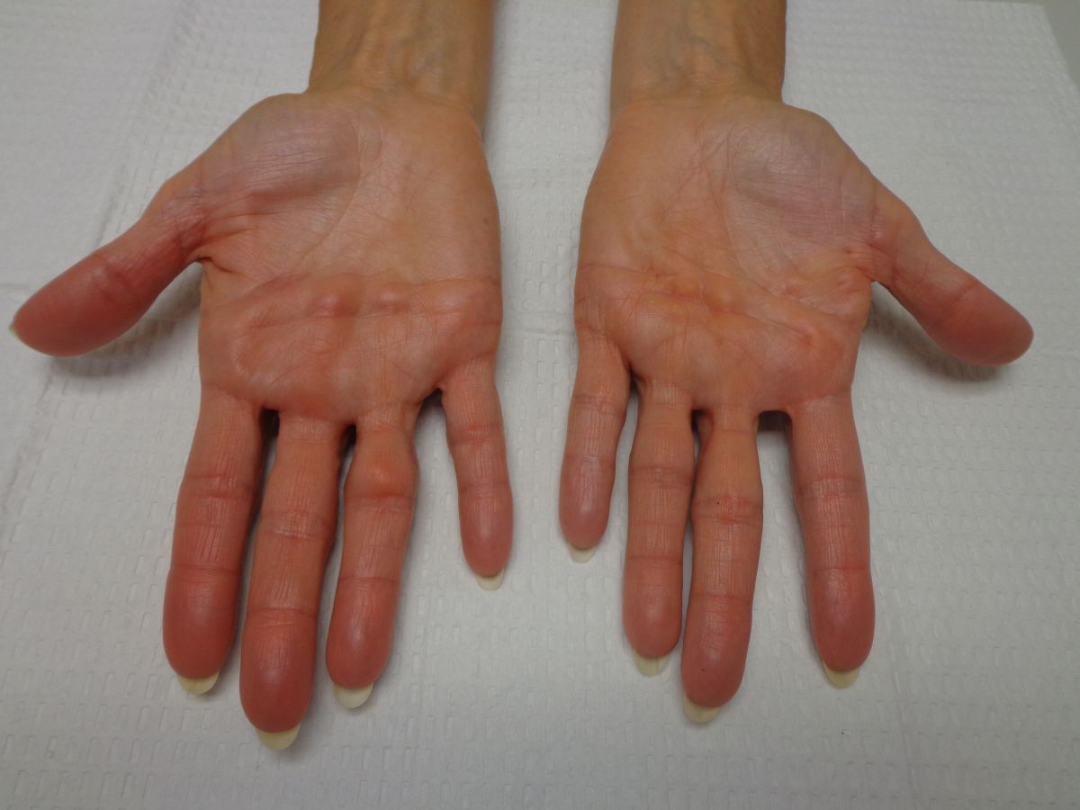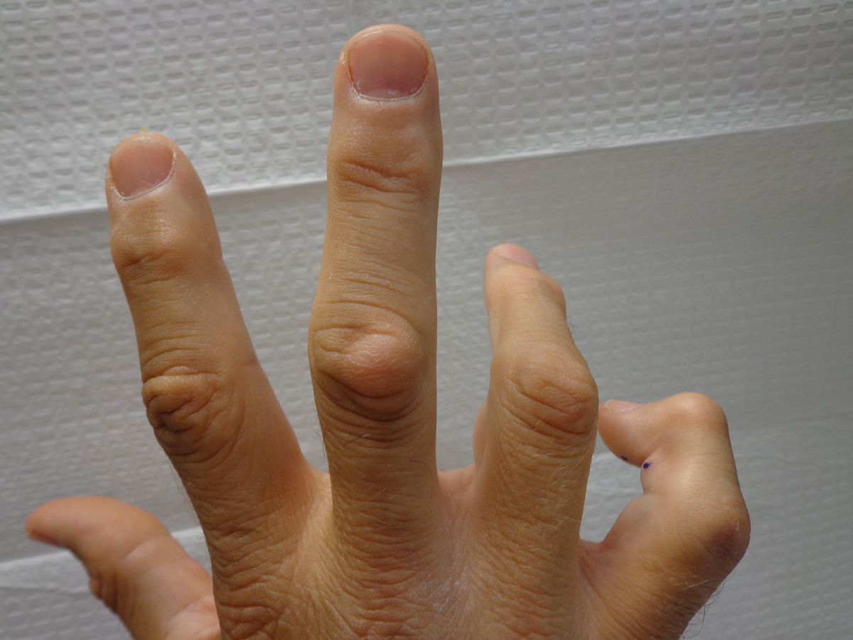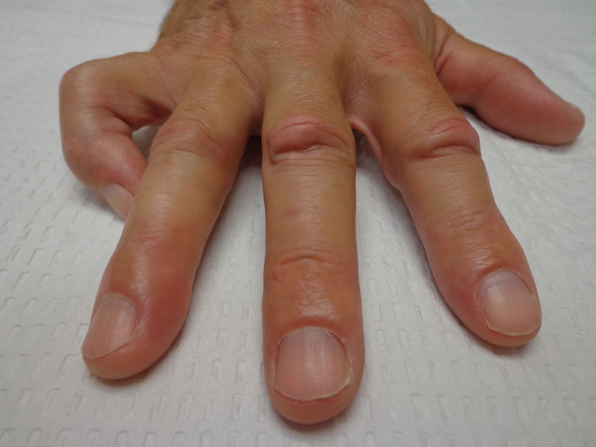 | Typical appearing knuckle pads on the middle and ring finger PIP joints of this 38 year old man. He has no evidence of Dupuytren's disease. |