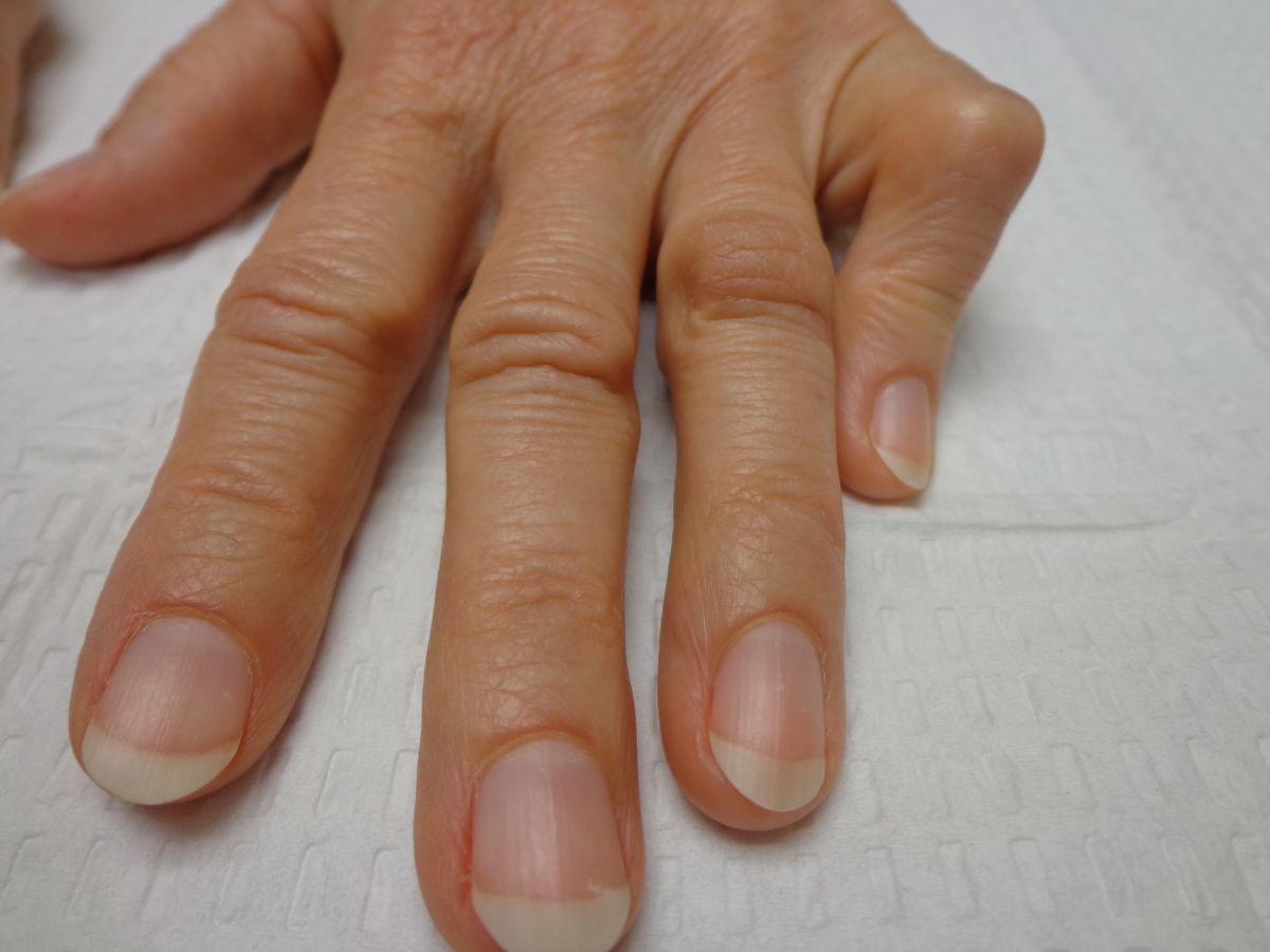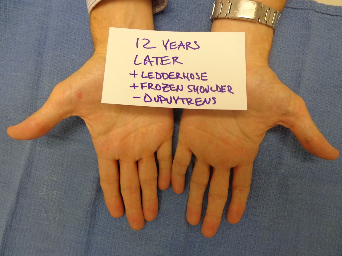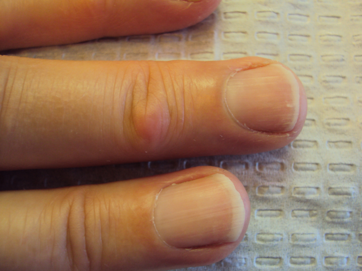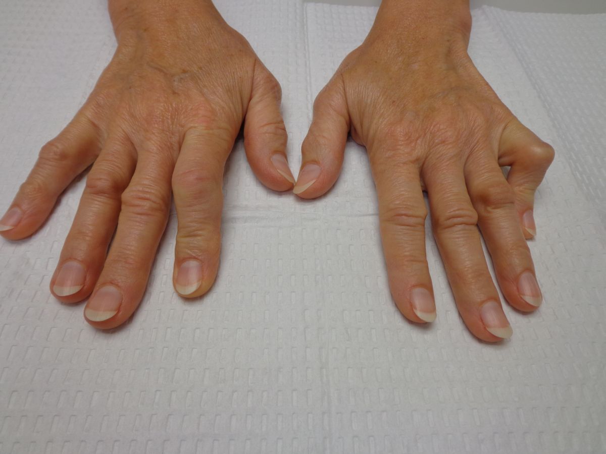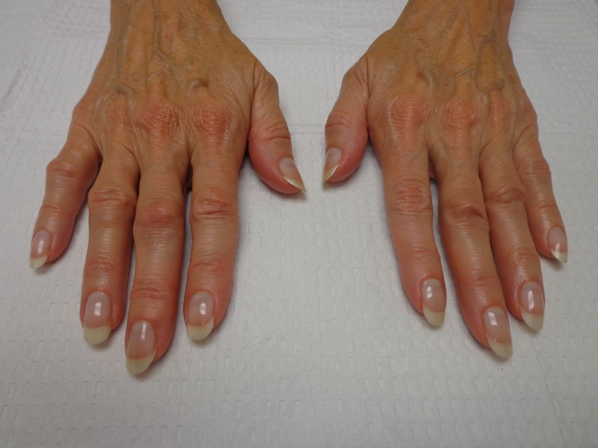 | Typical appearing knuckle pads on the middle and ring finger PIP joints of this 38 year old man. He has no evidence of Dupuytren's disease. |