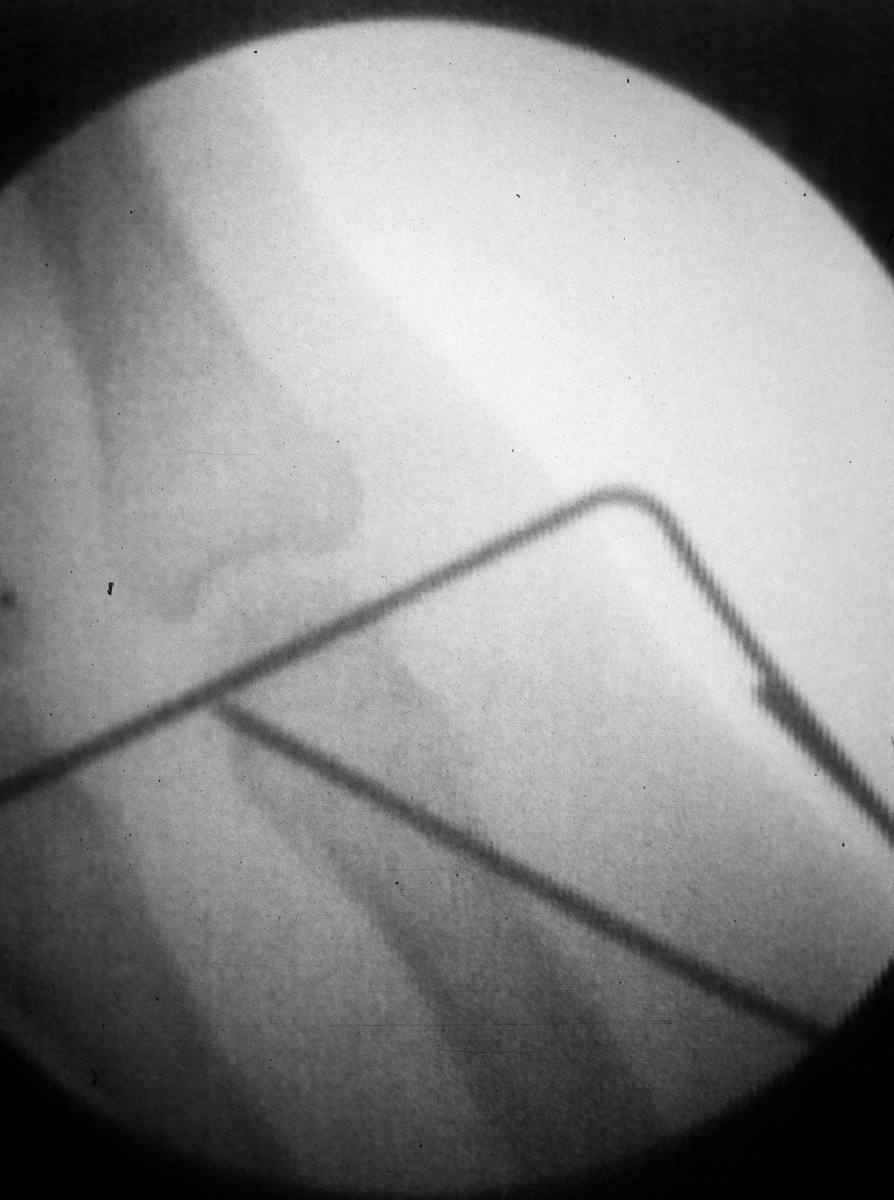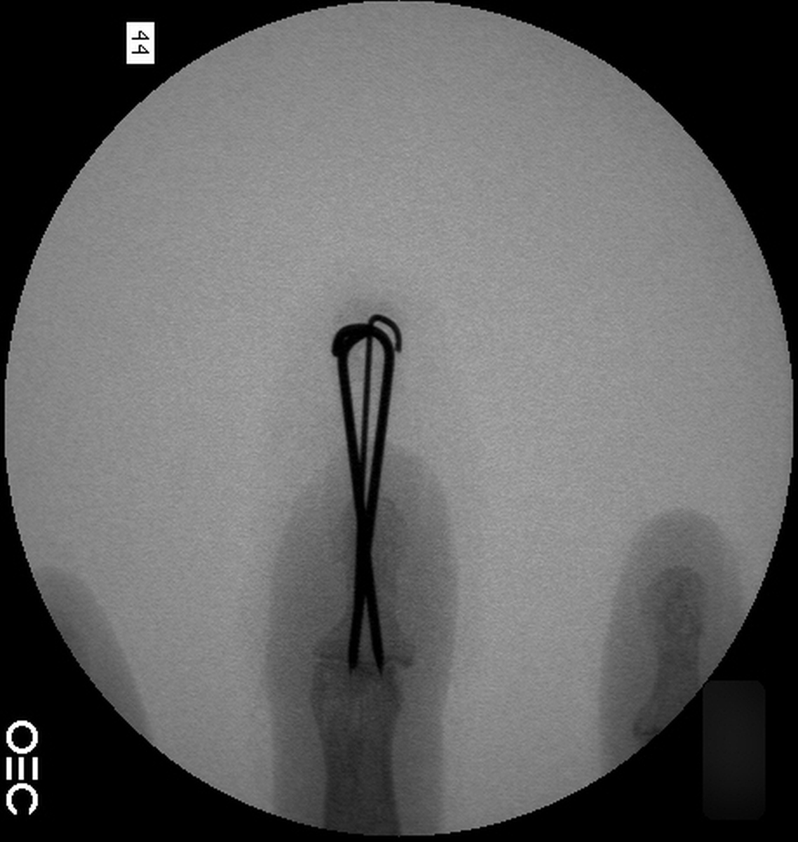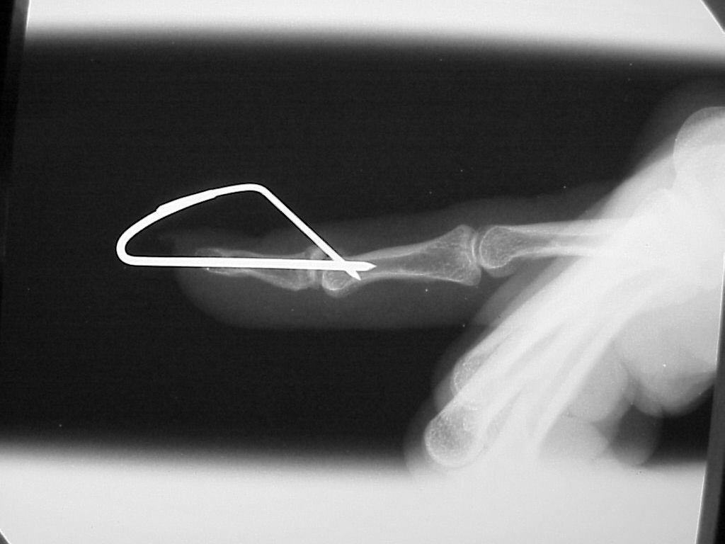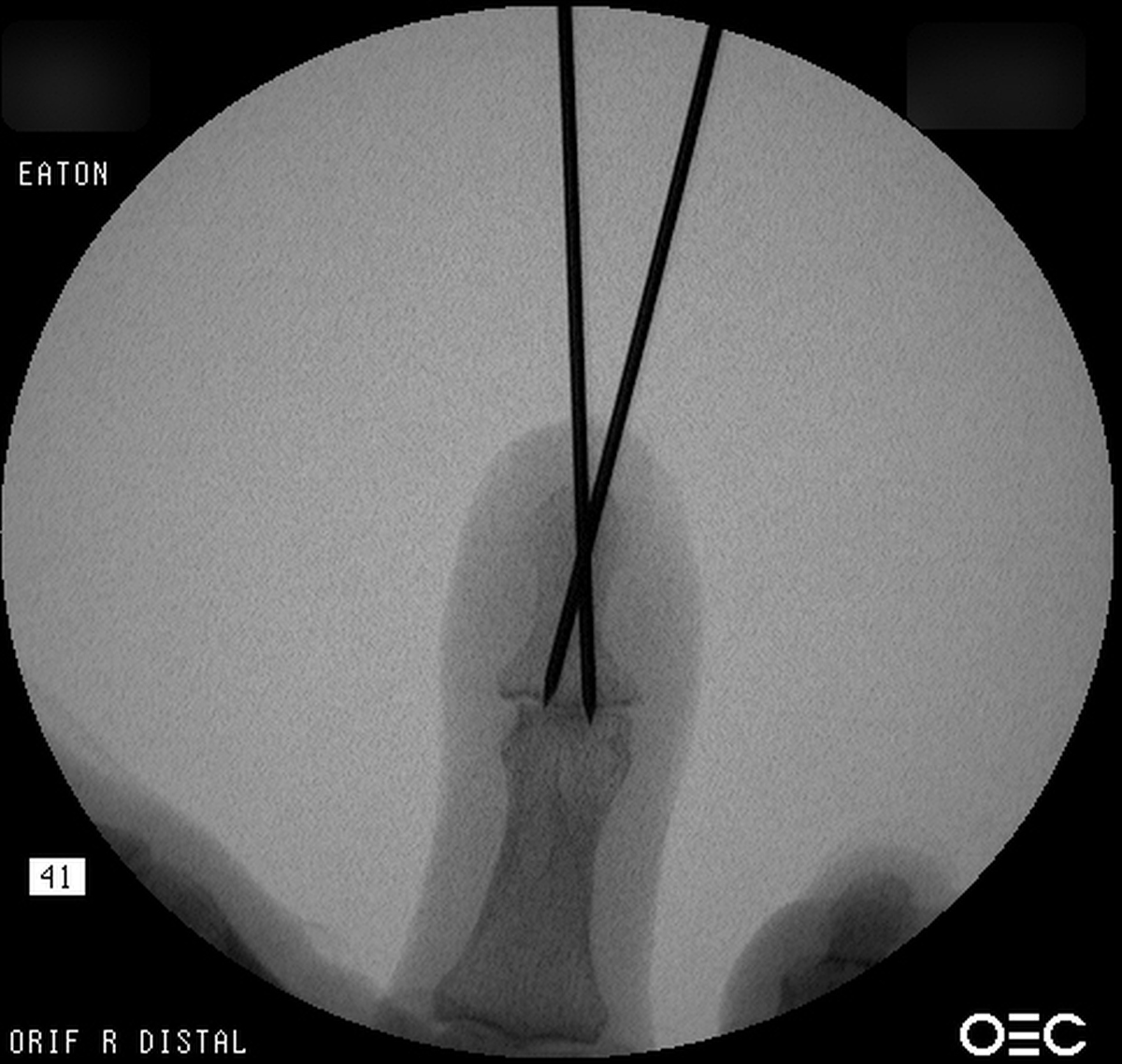 relating to infection risk and details of pin removal. One issue is that smooth pins are used, and may loosen or migrate. One solution to this is to leave the pins protruding through the skin, bend them to create a zone of overlap and glue the overlap together with thermoplastic splint material. This prevents pin migration and improves long term stability of the fixation. These cases demonstrate this technique in different scenarios of percutaneous fracture pinning. There are many other different options for each of these injury patterns. |