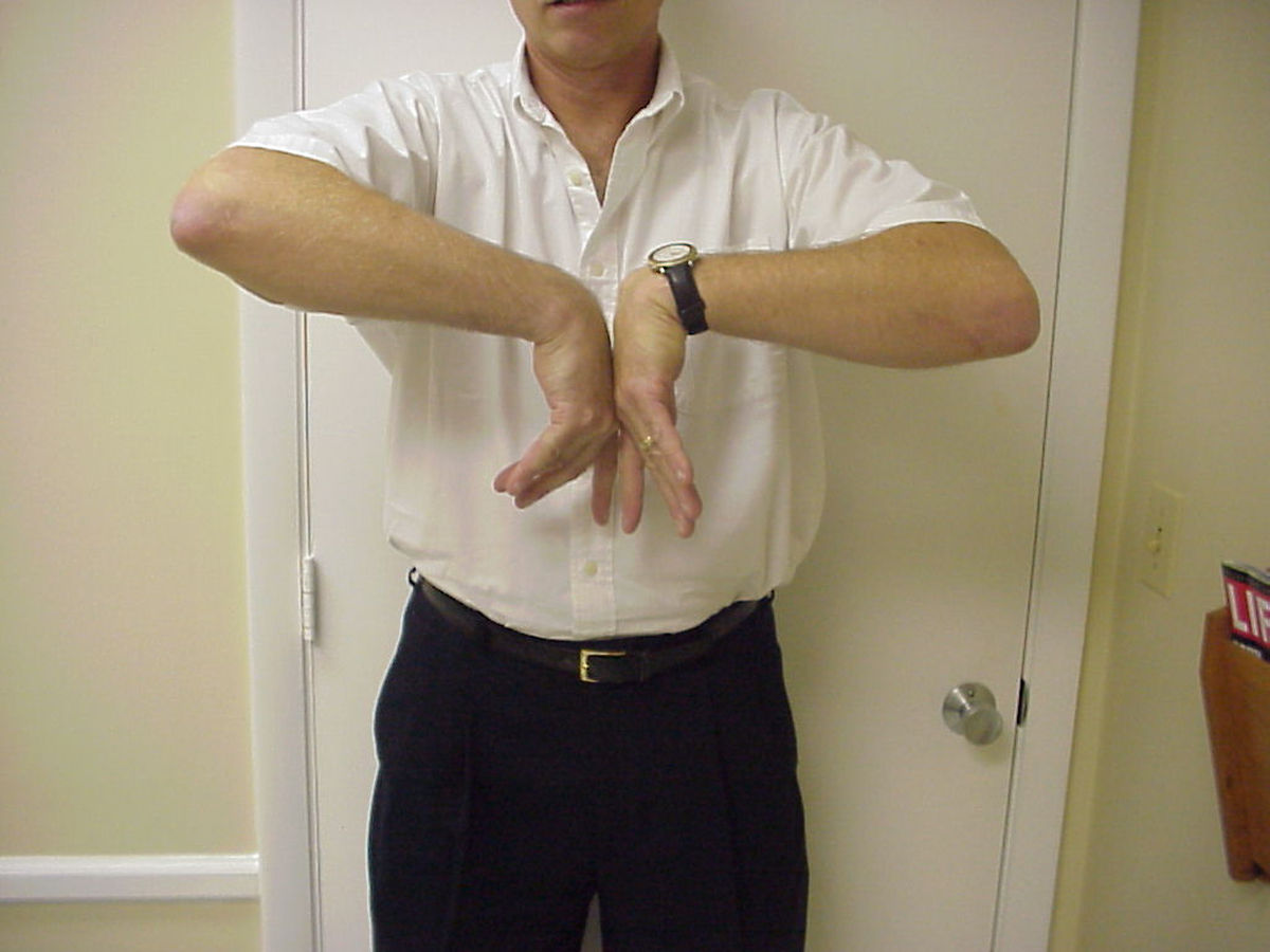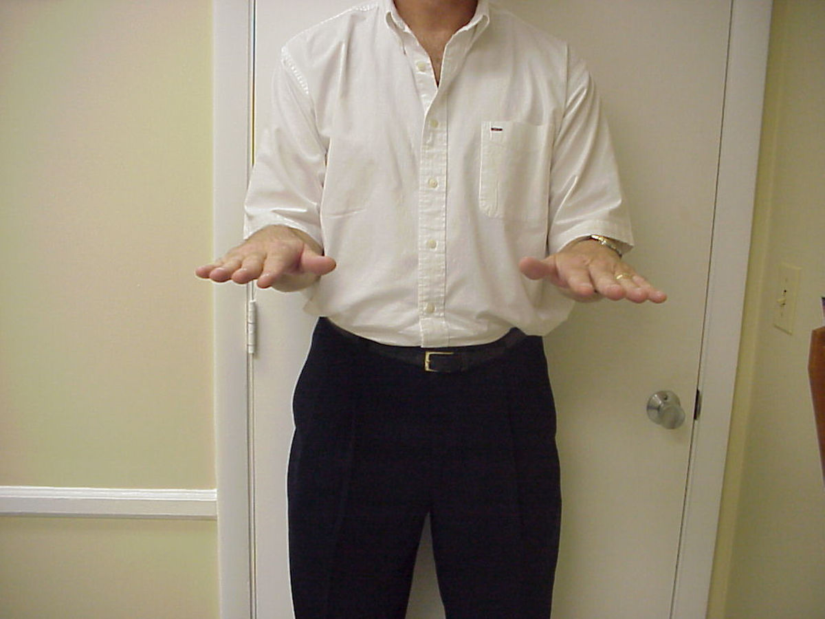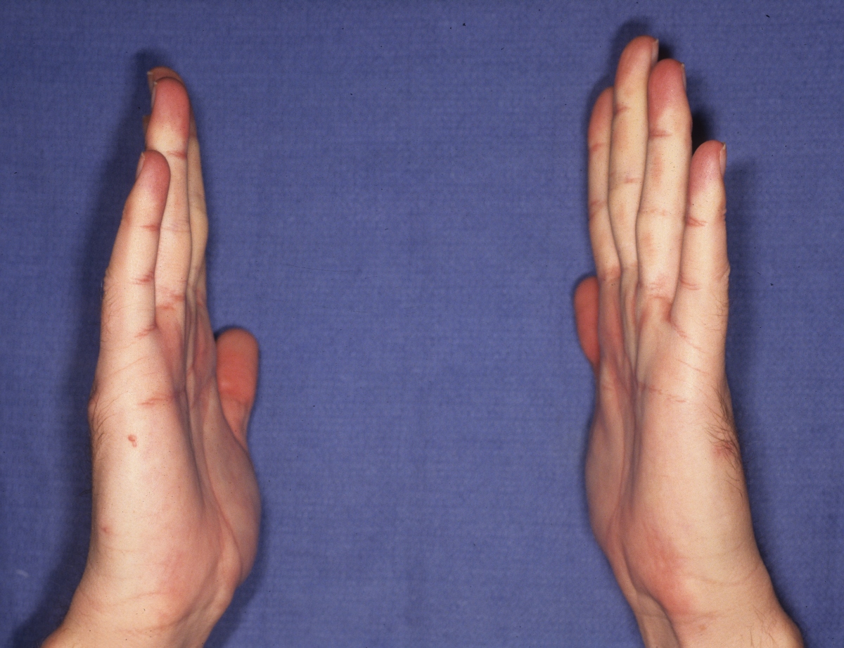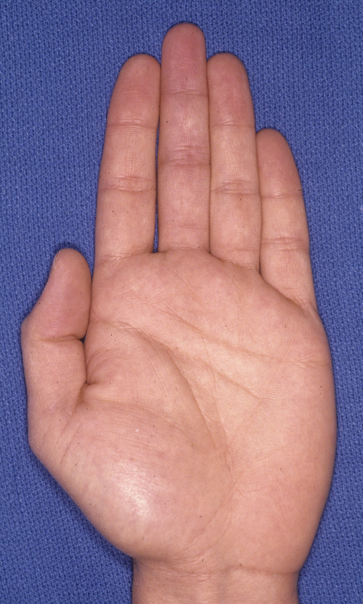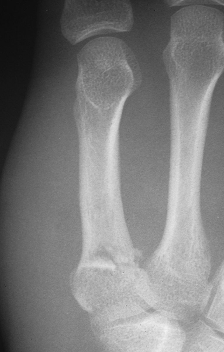 | The right hand sustained a small metacarpal neck fracture with palmar angulation. |