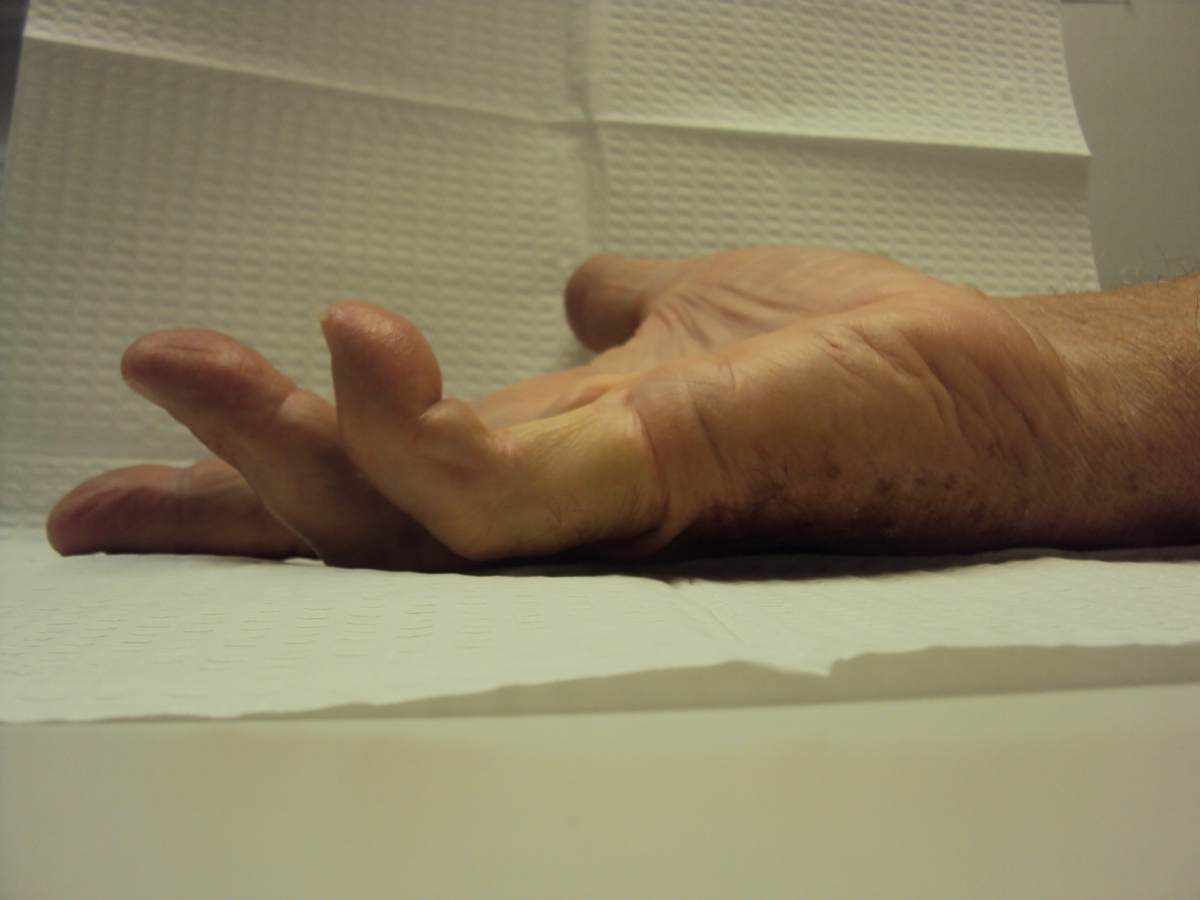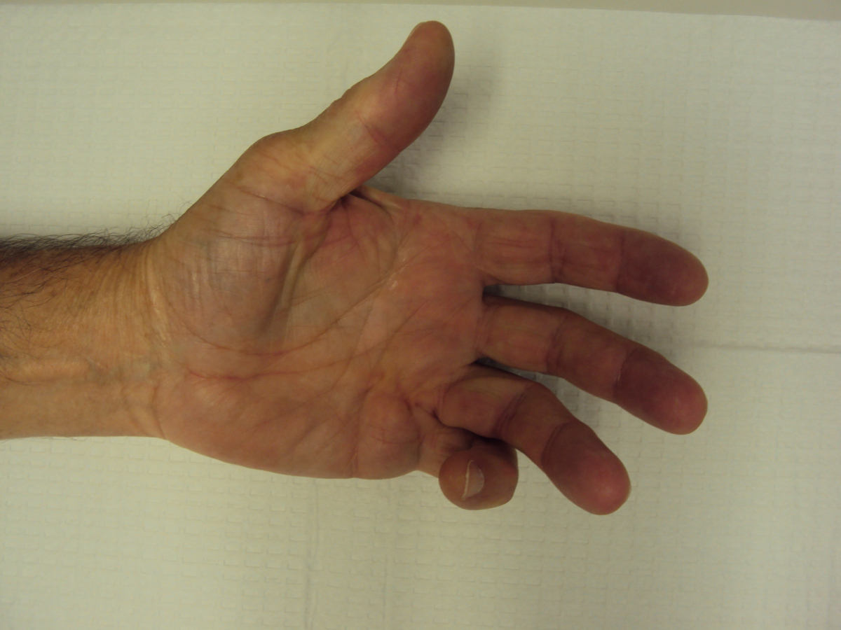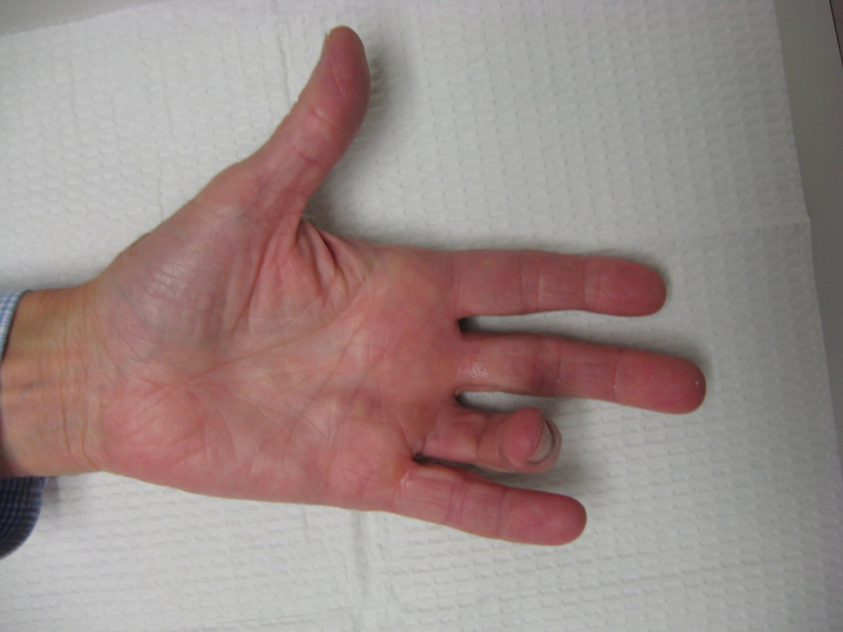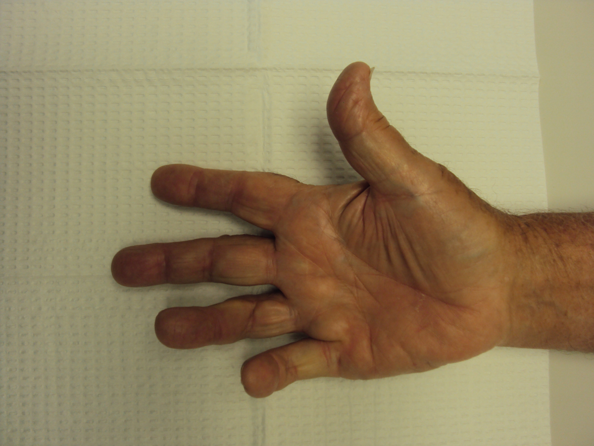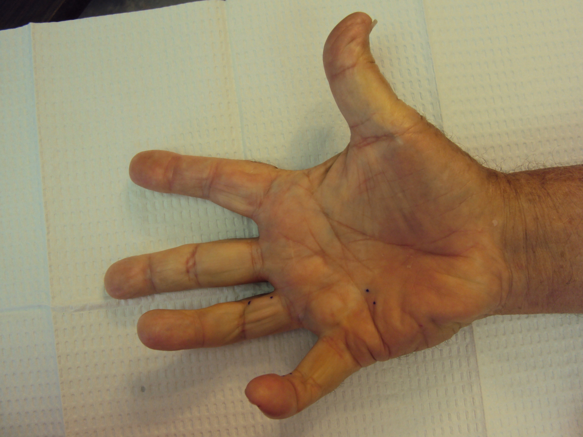 history of bilateral Dupuytren disease, worse on the right hand. |