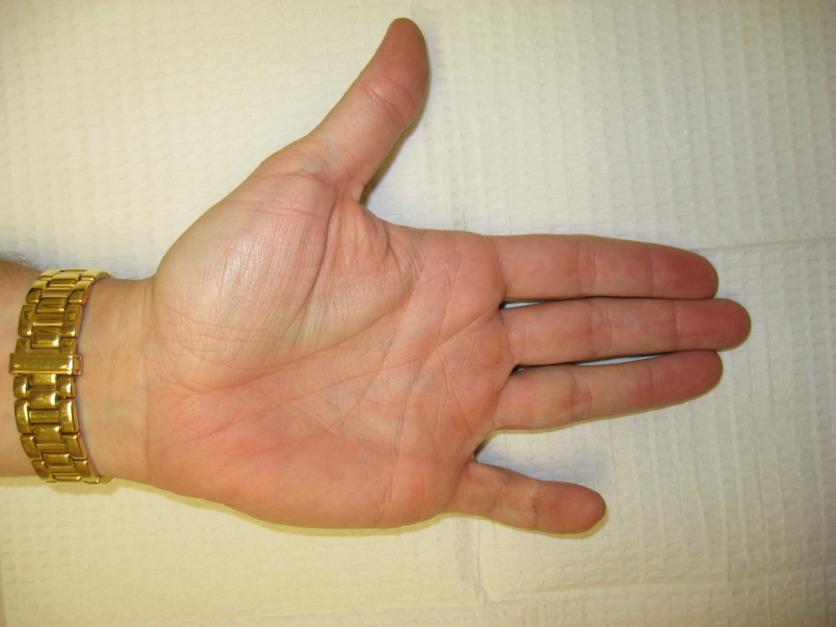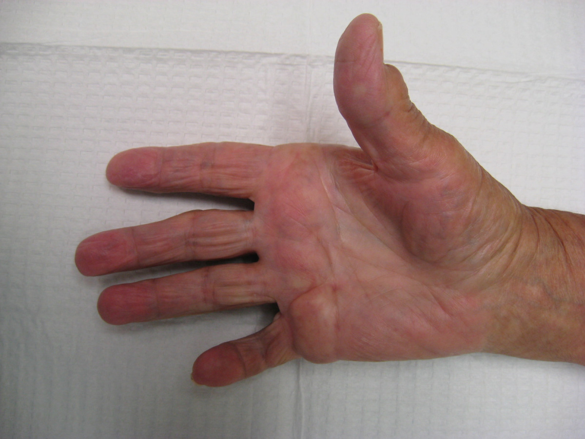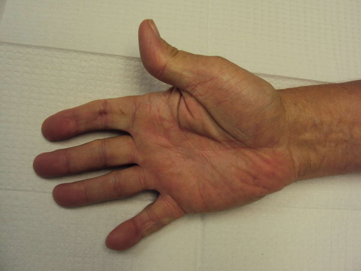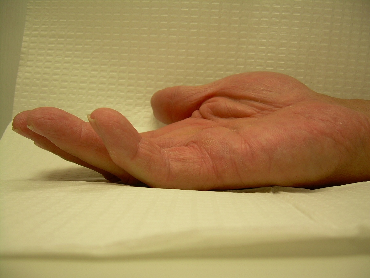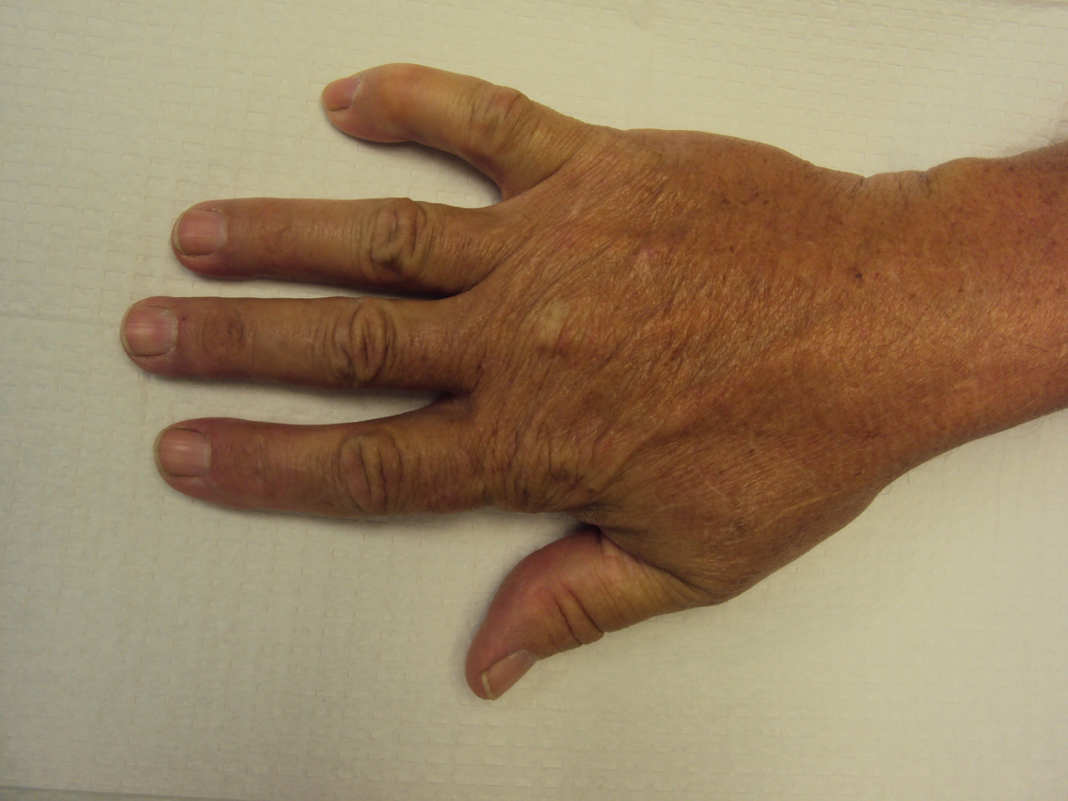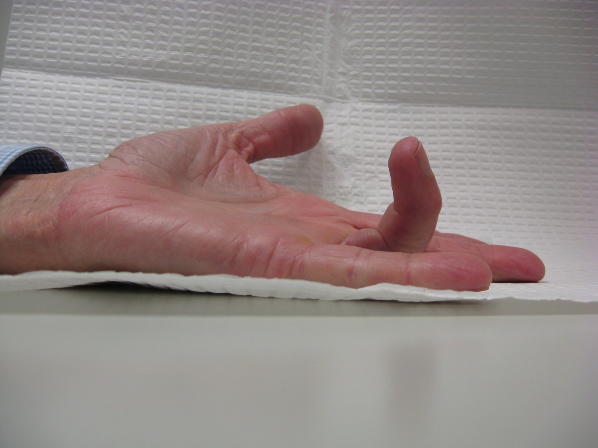 history of bilateral Dupuytren disease, worse on the right hand. |