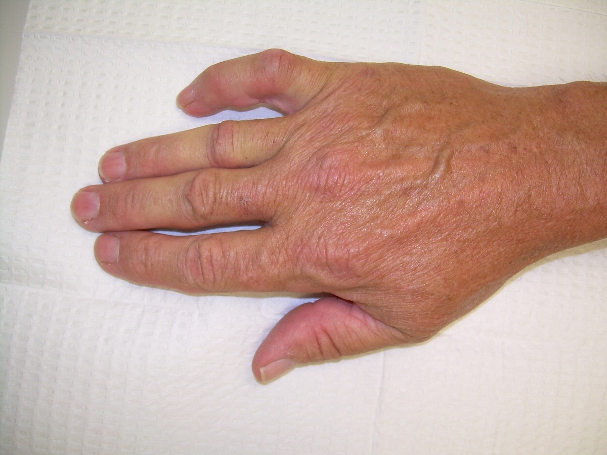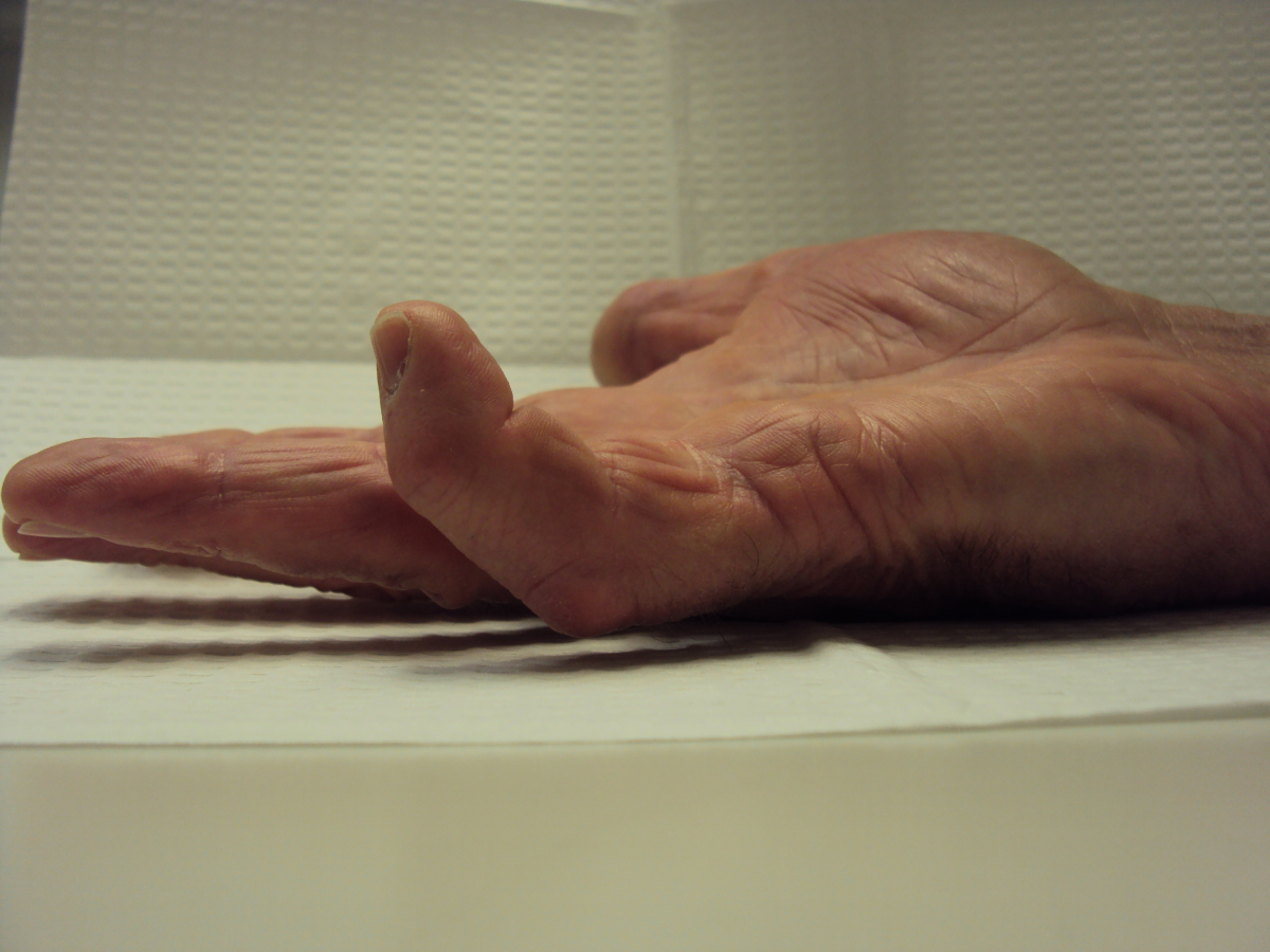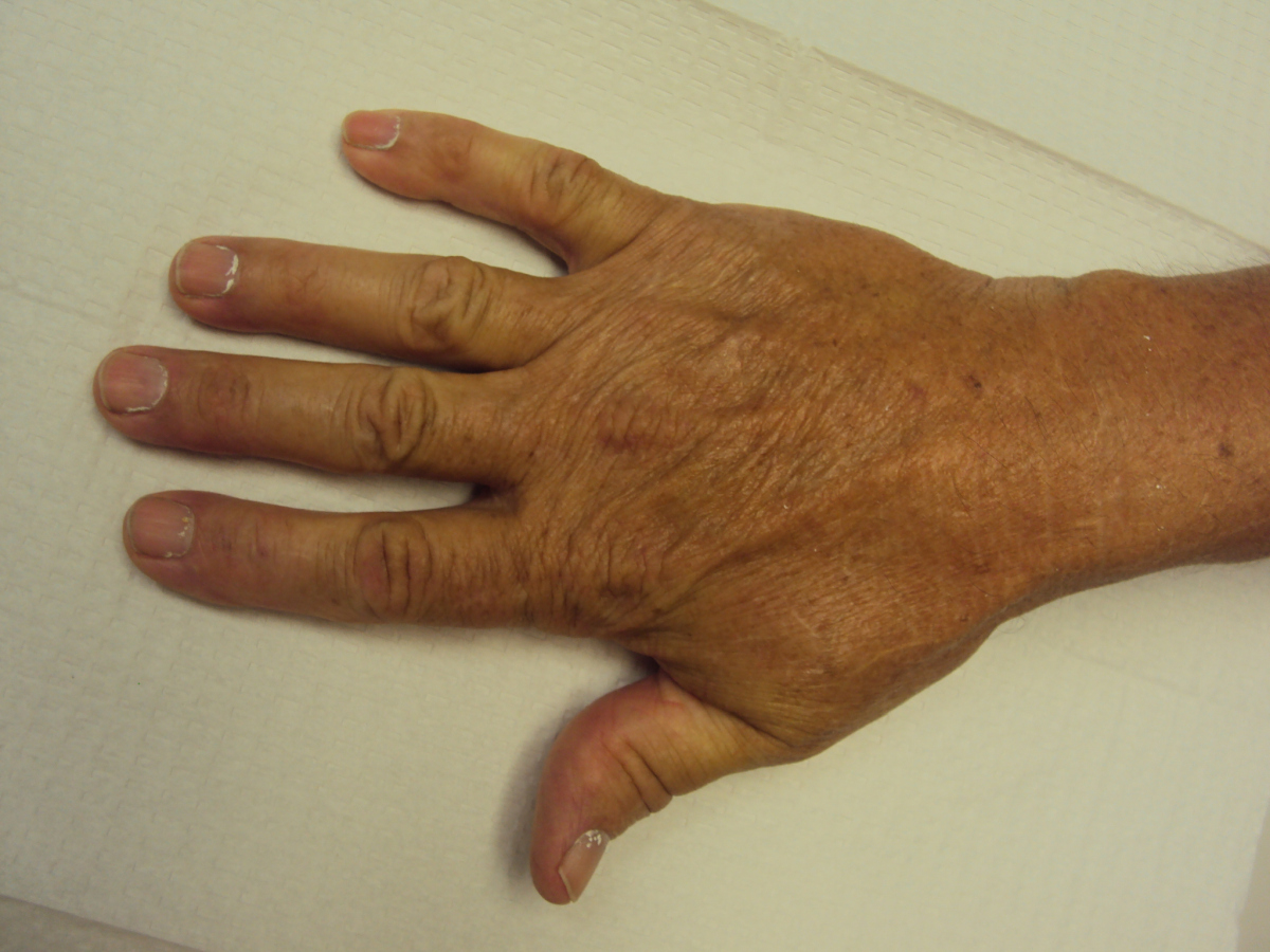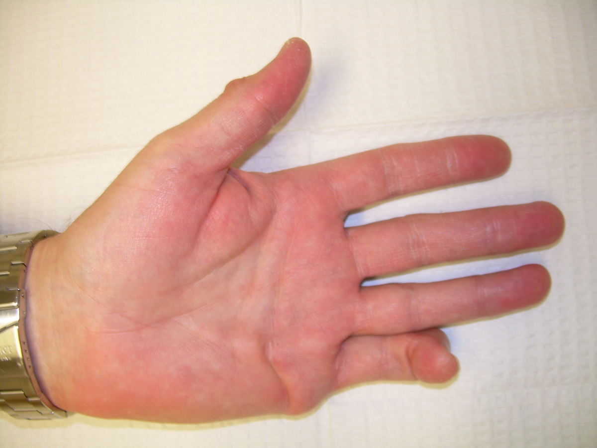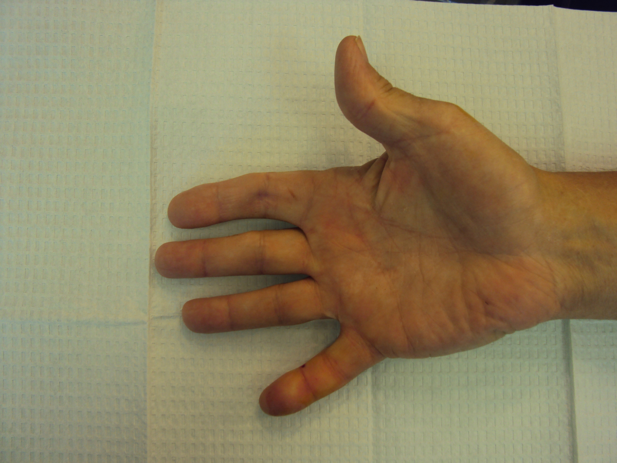 history of bilateral Dupuytren disease, worse on the right hand. |