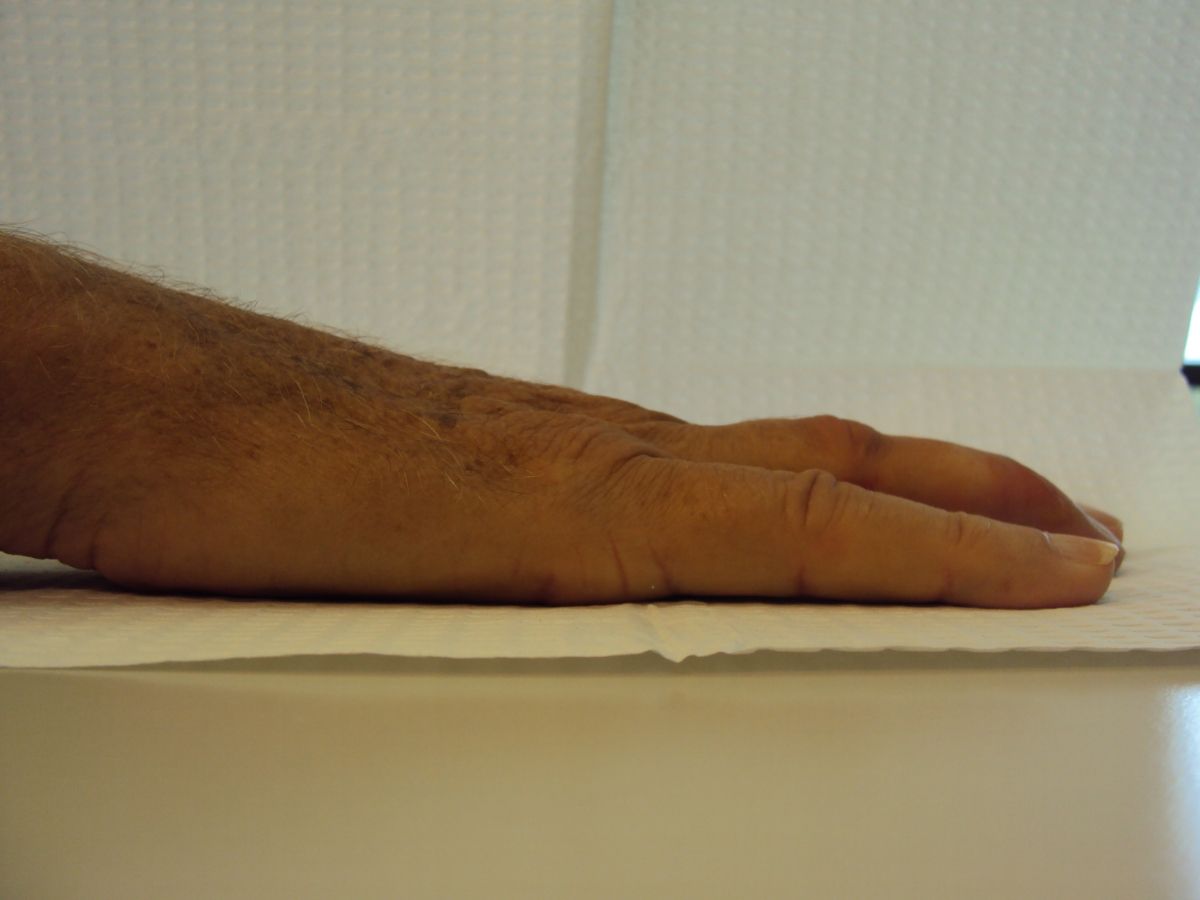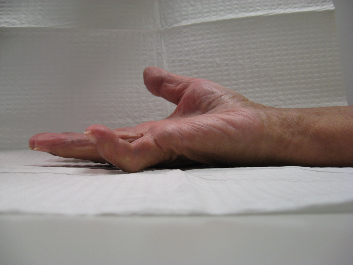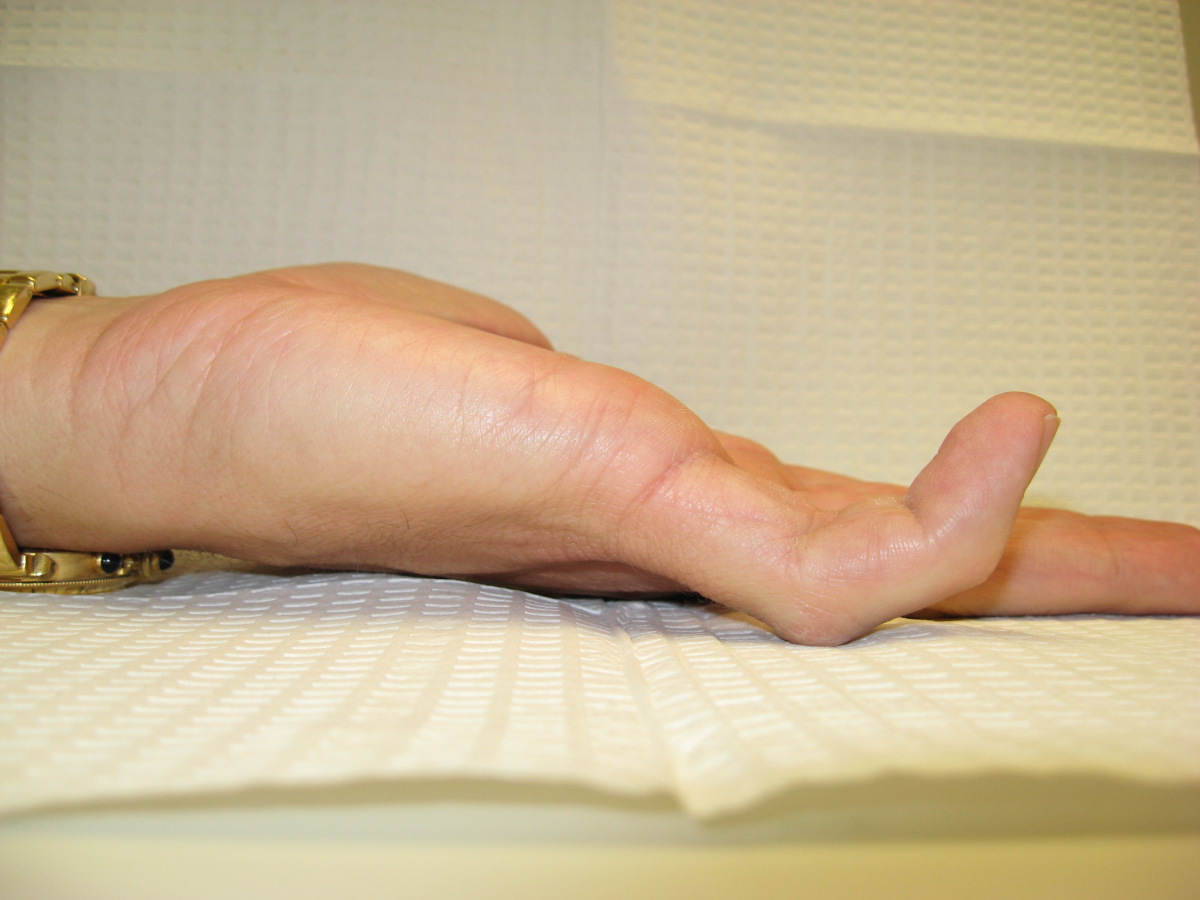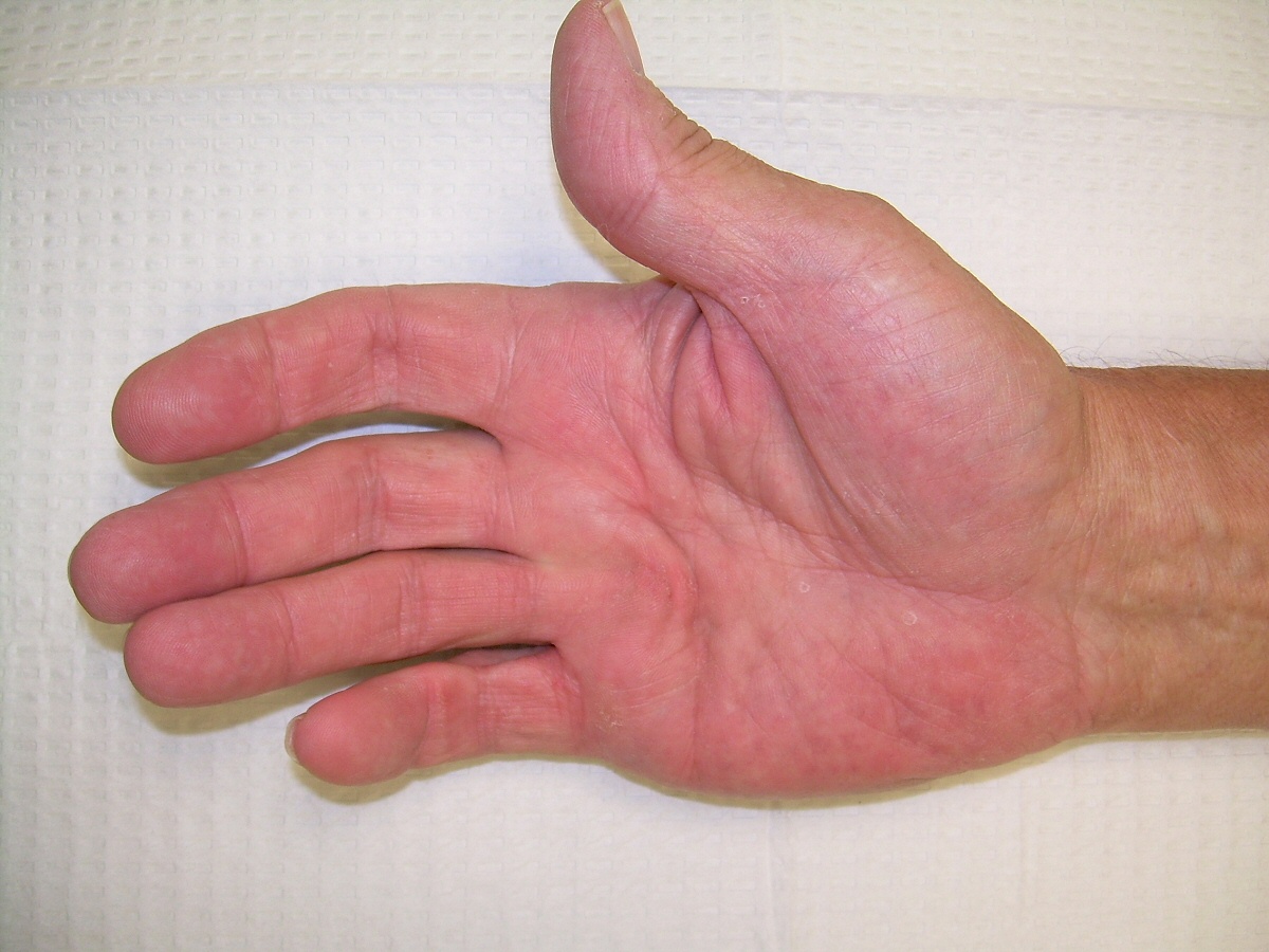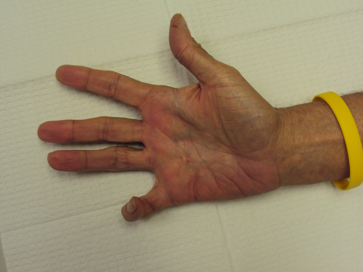 history of bilateral Dupuytren disease, worse on the right hand. |