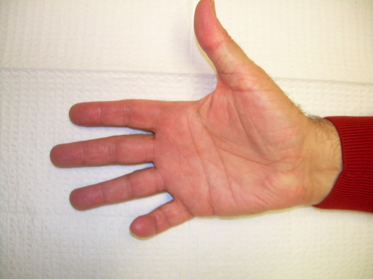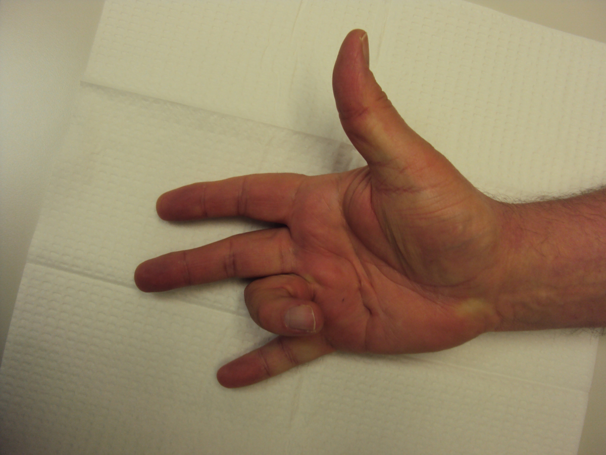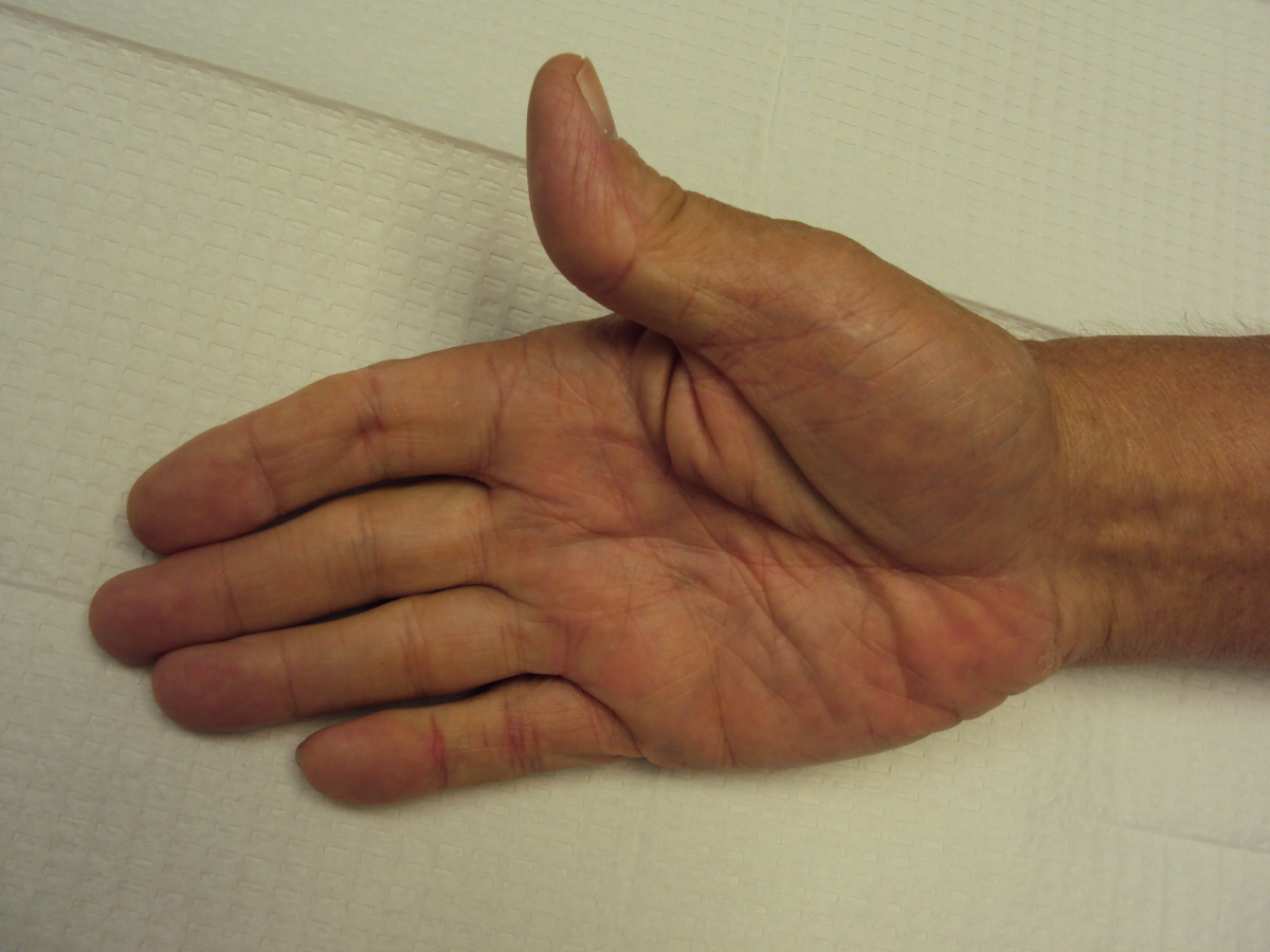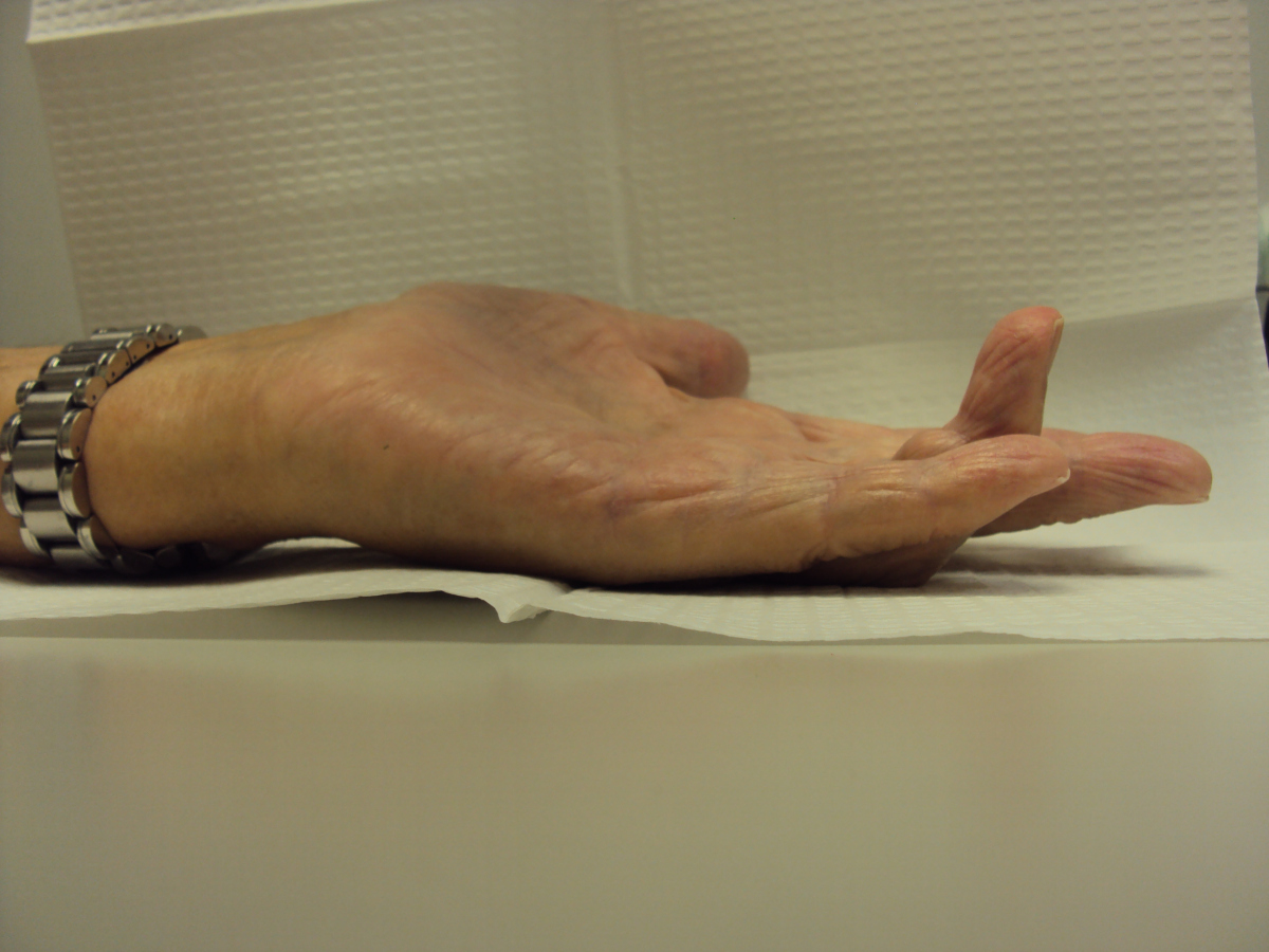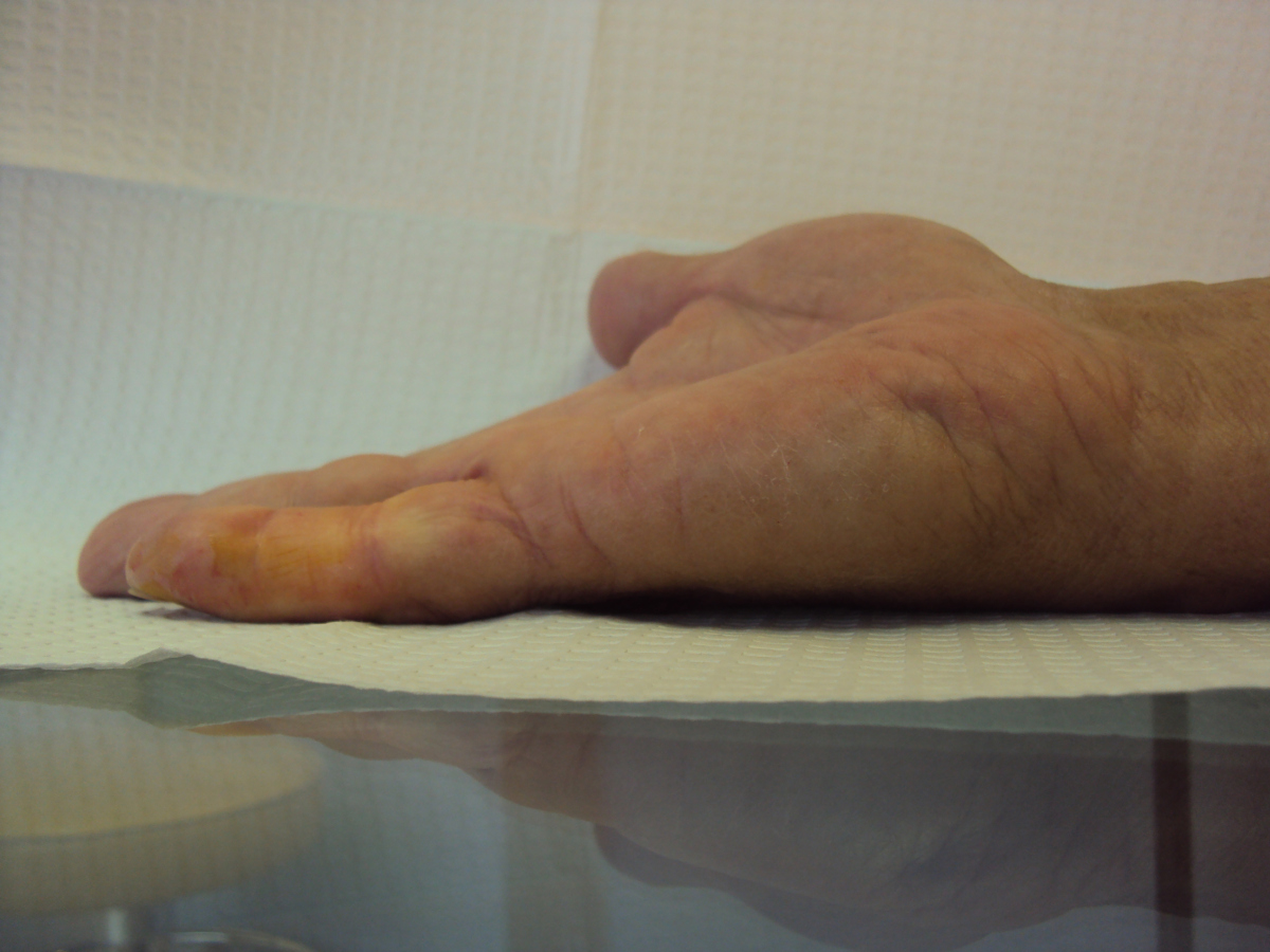 history of bilateral Dupuytren disease, worse on the right hand. |