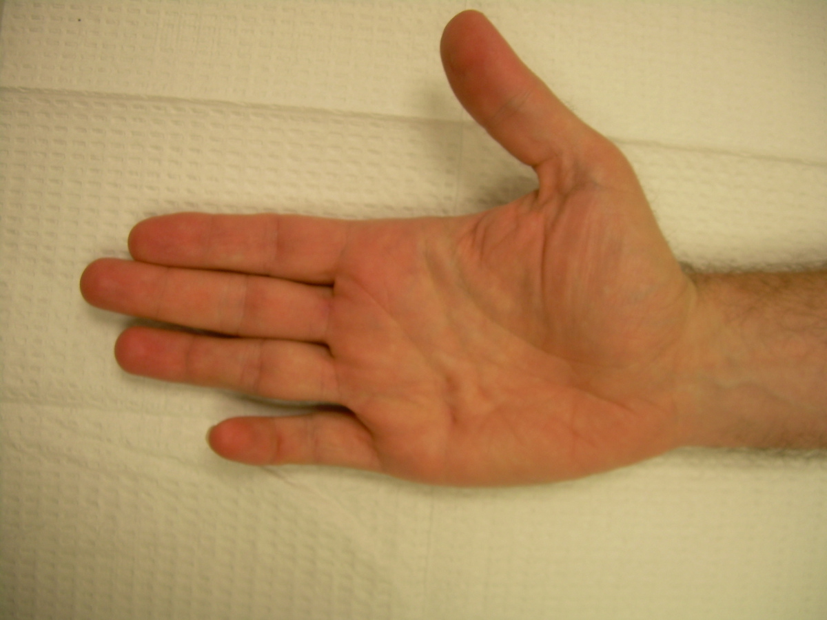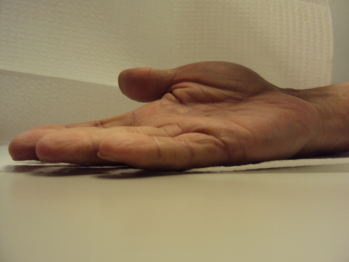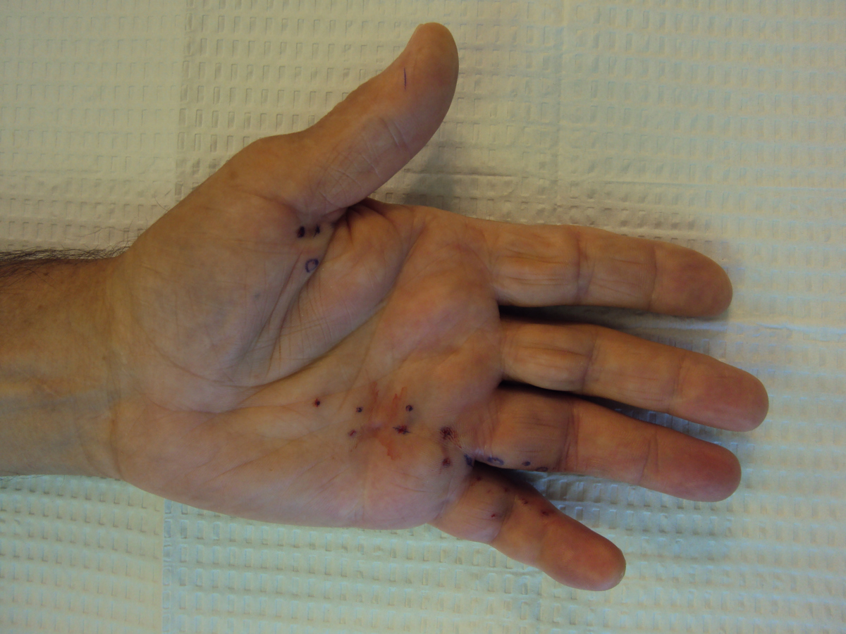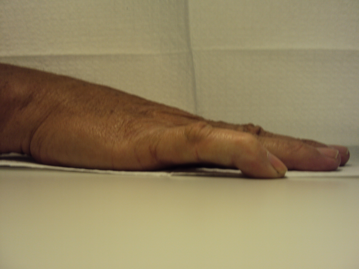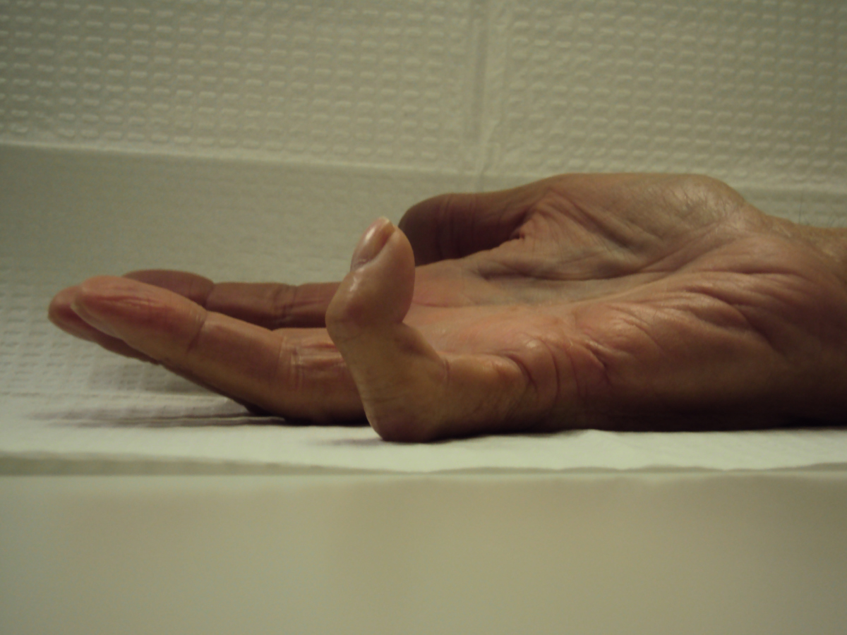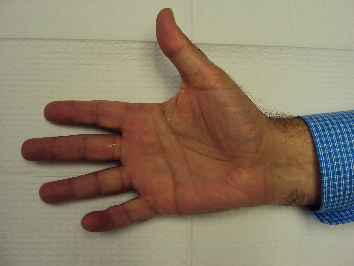 history of bilateral Dupuytren disease, worse on the right hand. |