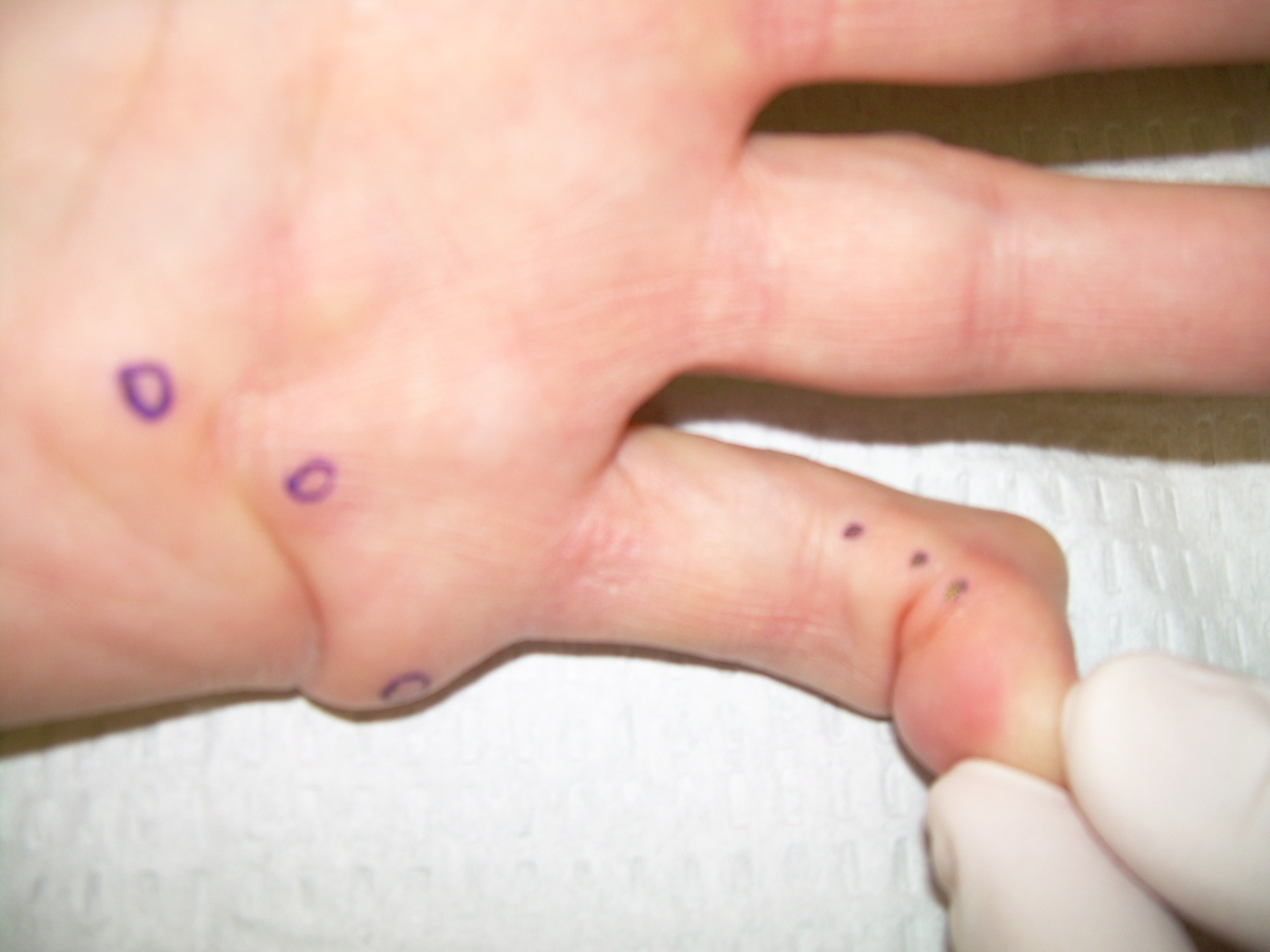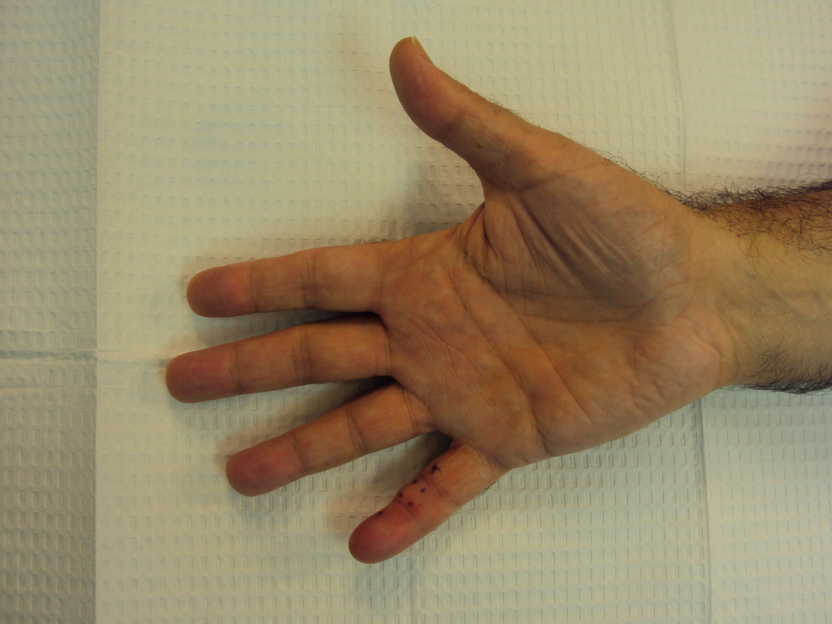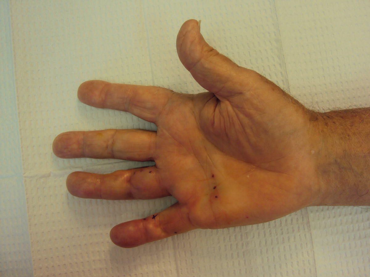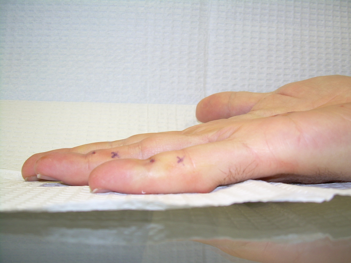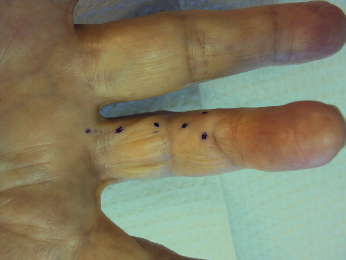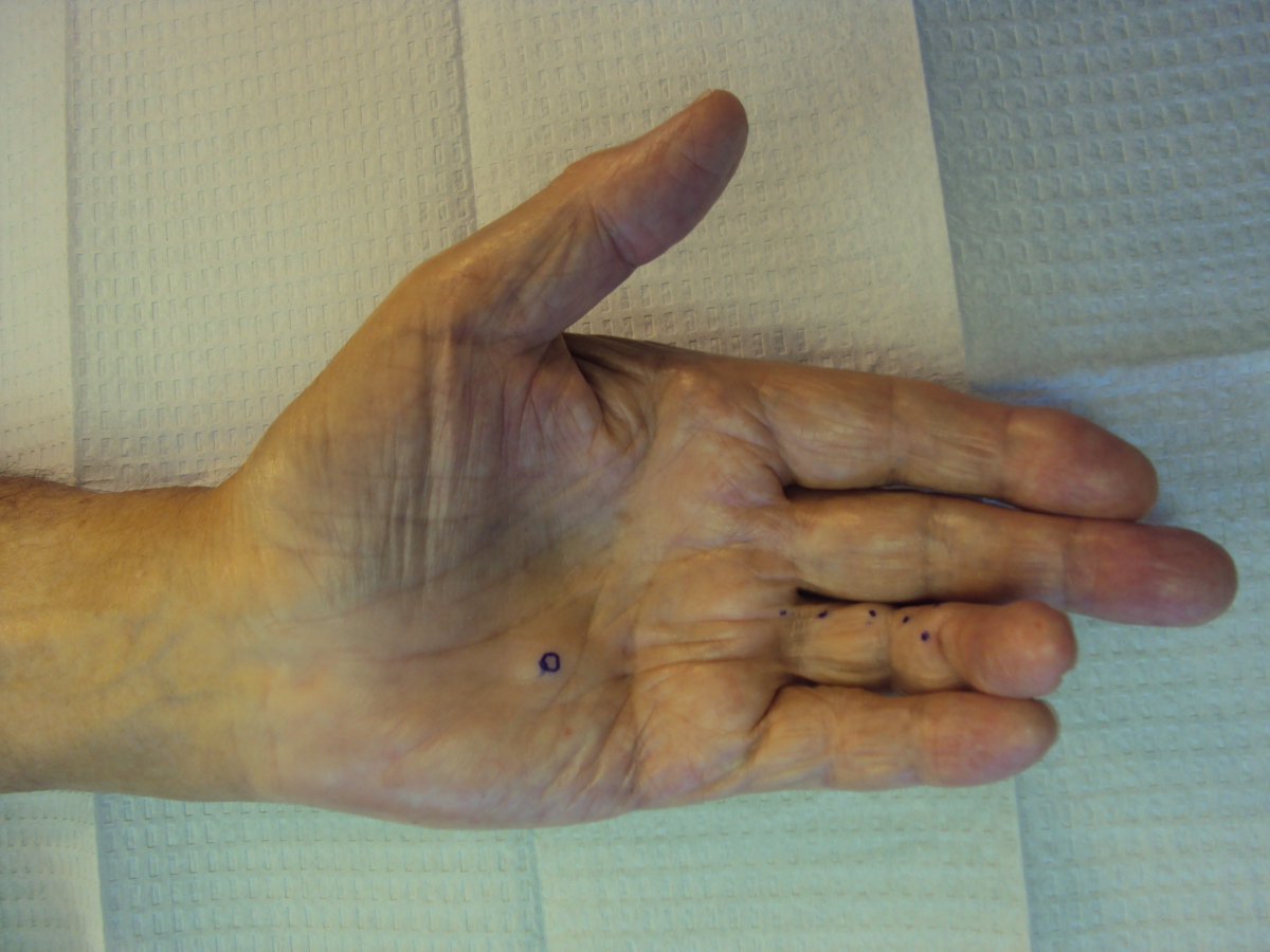 distal interphalangeal joint. The functional impact of this is that it contributes to the fingertip catching on things like a hook. Isolated interphalangeal joint contractures in the context of hyperextensible metacarpophalangeal joints allow patients to defer evaluation until the contracture is severe. The most common method of treating this is with fasciectomy, but needle fasciotomy may be effective. Collagenase has been used for this, but is an off-label application. As with needle release or collagenase treatment of the proximal interphalangeal joint, recurrence is expected: these minimal procedures should be considered a temporizing step with expectations of partial improvement. The following are examples of percutaneous needle fasciotomy for a variety of contractures involving the distal interphalangeal joint. Portals proximal and/or distal to the distal interphalangeal joint flexion creases are used, some bilaterally. These are presented to illustrate the diversity of even this subset of Dupuytren disease. None had prior treatment. Marking legend: . = Needle portals o = depot steroid injection x = portal planned, but not used. The technique is essentially the same as that for isolated PIP joint release, as shown here. |