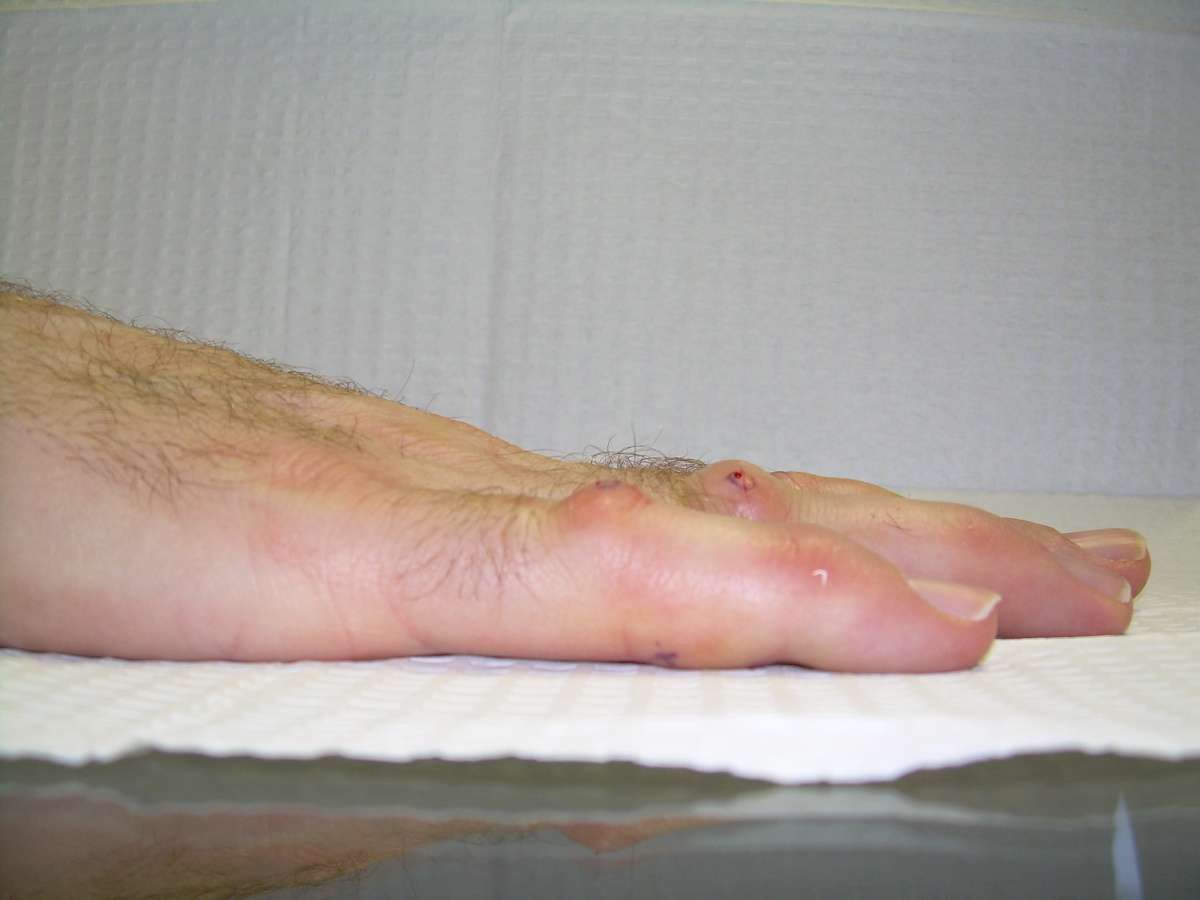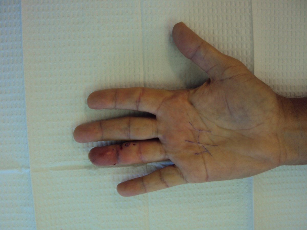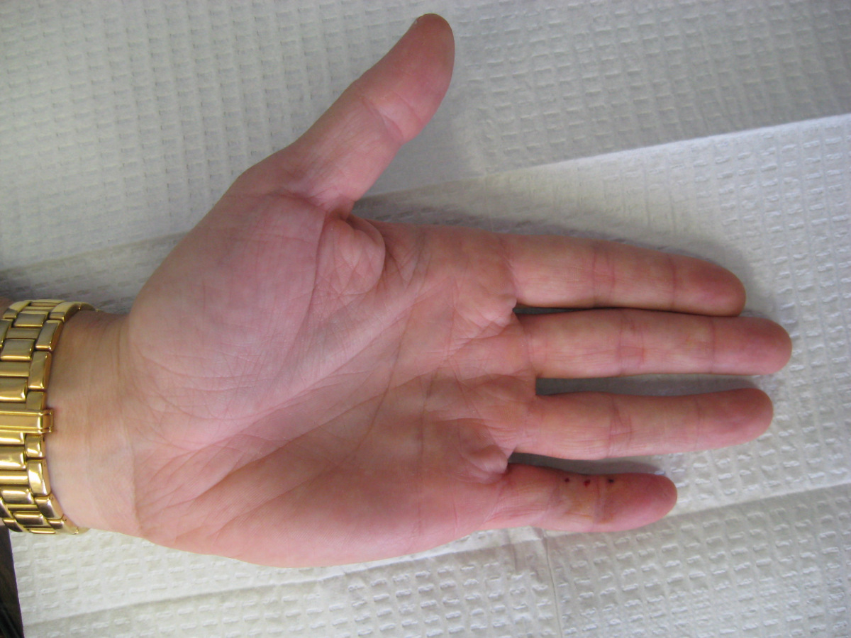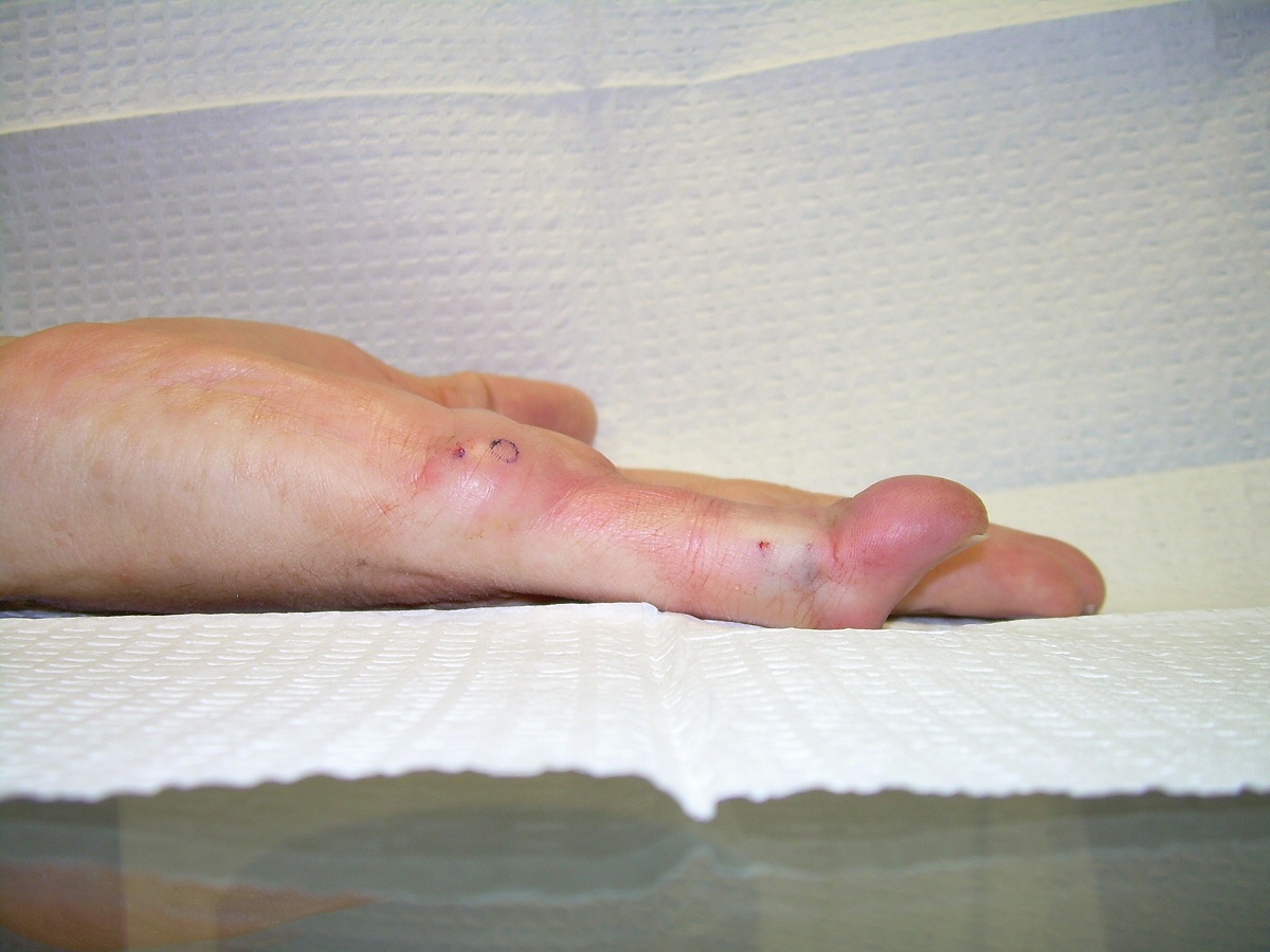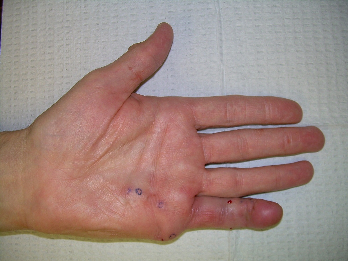 distal interphalangeal joint. The functional impact of this is that it contributes to the fingertip catching on things like a hook. Isolated interphalangeal joint contractures in the context of hyperextensible metacarpophalangeal joints allow patients to defer evaluation until the contracture is severe. The most common method of treating this is with fasciectomy, but needle fasciotomy may be effective. Collagenase has been used for this, but is an off-label application. As with needle release or collagenase treatment of the proximal interphalangeal joint, recurrence is expected: these minimal procedures should be considered a temporizing step with expectations of partial improvement. The following are examples of percutaneous needle fasciotomy for a variety of contractures involving the distal interphalangeal joint. Portals proximal and/or distal to the distal interphalangeal joint flexion creases are used, some bilaterally. These are presented to illustrate the diversity of even this subset of Dupuytren disease. None had prior treatment. Marking legend: . = Needle portals o = depot steroid injection x = portal planned, but not used. The technique is essentially the same as that for isolated PIP joint release, as shown here. |