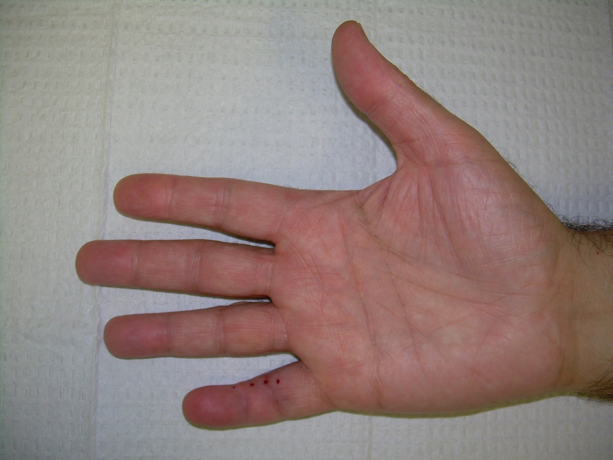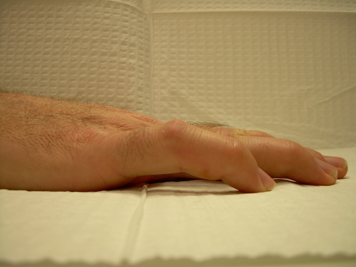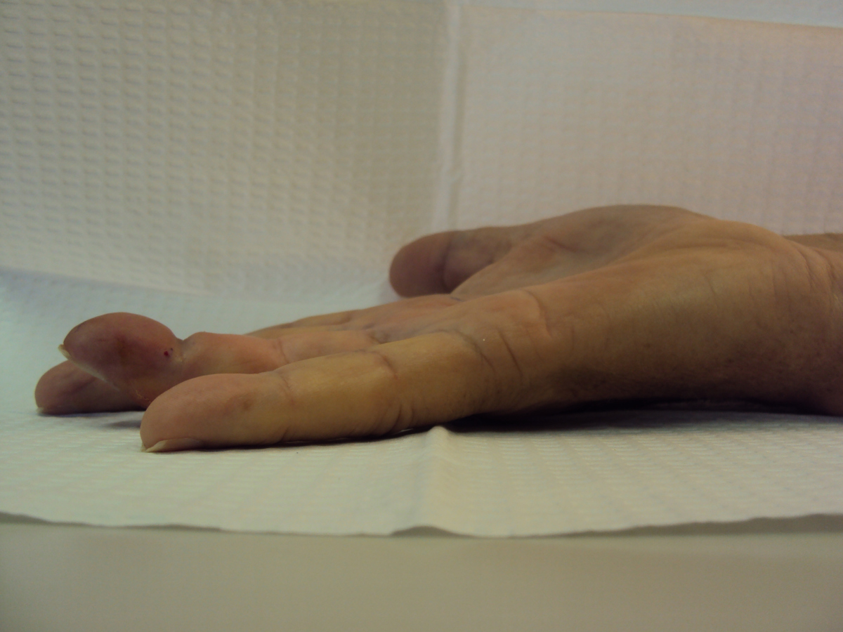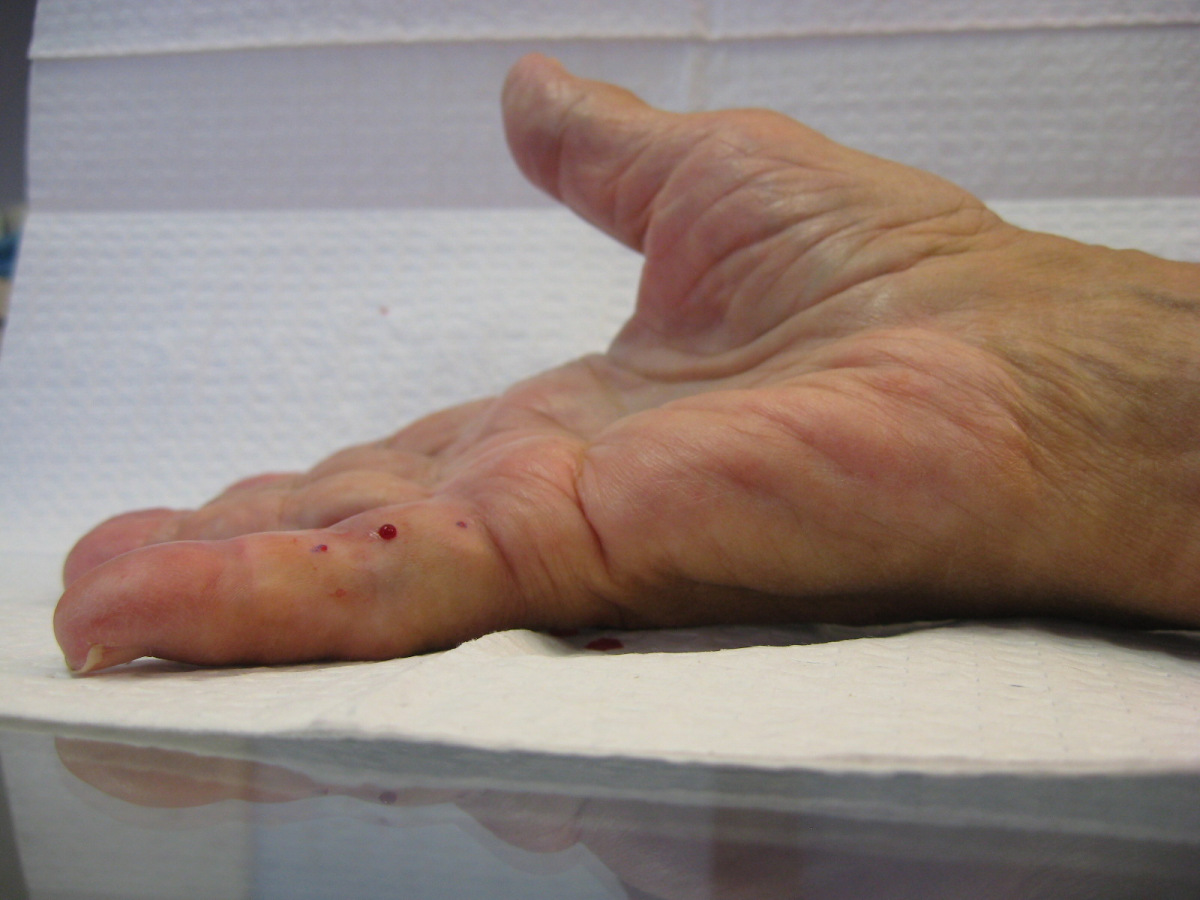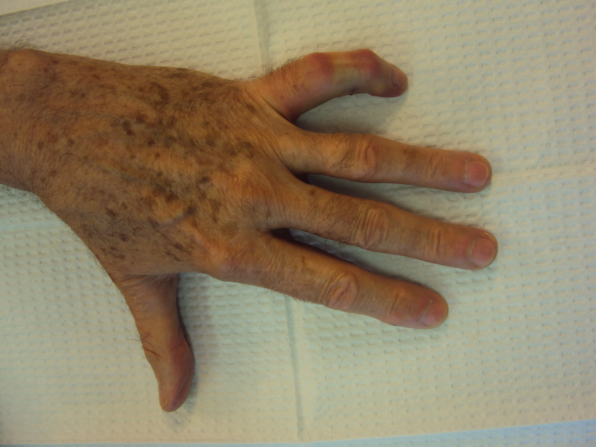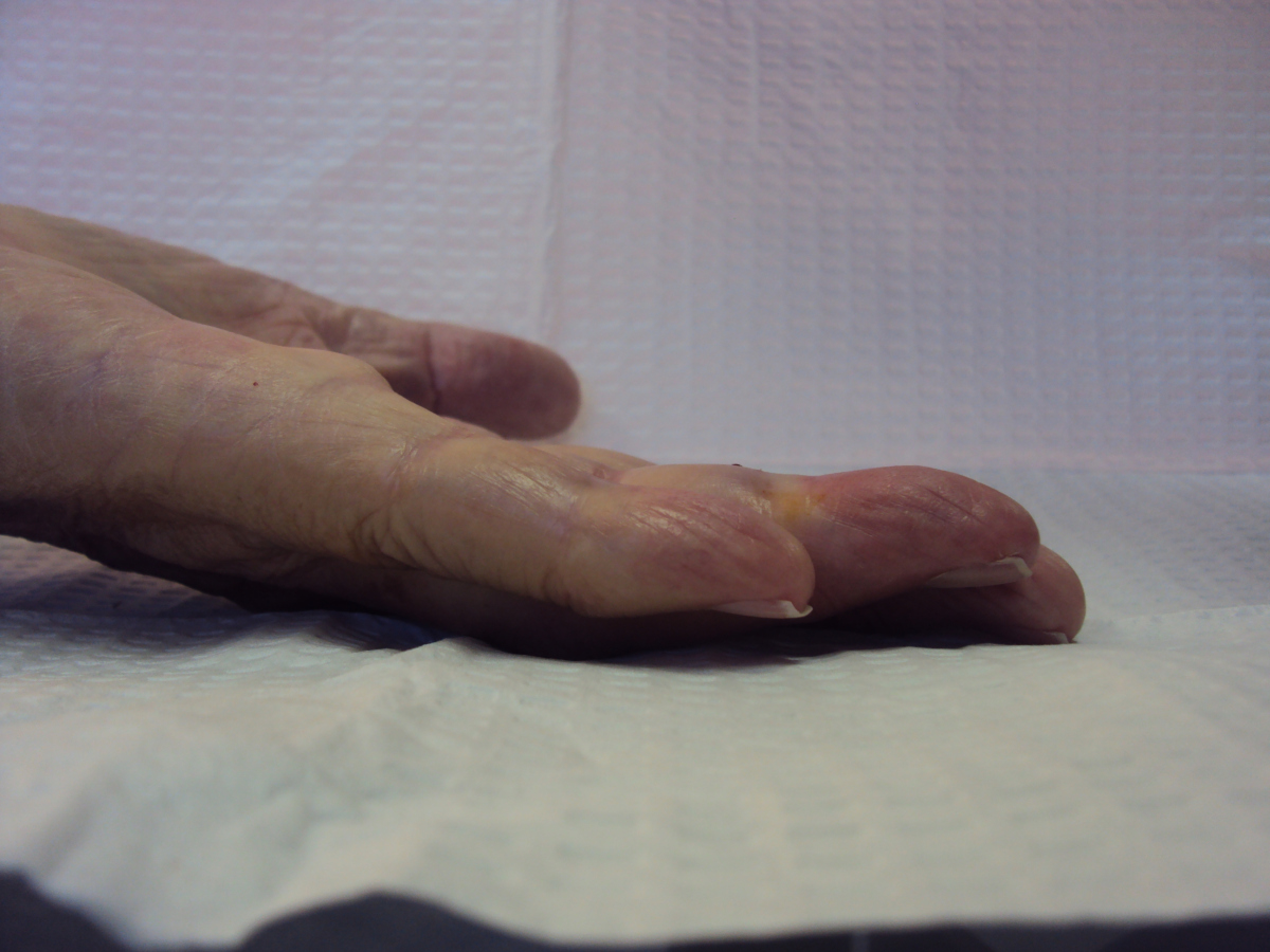 distal interphalangeal joint. The functional impact of this is that it contributes to the fingertip catching on things like a hook. Isolated interphalangeal joint contractures in the context of hyperextensible metacarpophalangeal joints allow patients to defer evaluation until the contracture is severe. The most common method of treating this is with fasciectomy, but needle fasciotomy may be effective. Collagenase has been used for this, but is an off-label application. As with needle release or collagenase treatment of the proximal interphalangeal joint, recurrence is expected: these minimal procedures should be considered a temporizing step with expectations of partial improvement. The following are examples of percutaneous needle fasciotomy for a variety of contractures involving the distal interphalangeal joint. Portals proximal and/or distal to the distal interphalangeal joint flexion creases are used, some bilaterally. These are presented to illustrate the diversity of even this subset of Dupuytren disease. None had prior treatment. Marking legend: . = Needle portals o = depot steroid injection x = portal planned, but not used. The technique is essentially the same as that for isolated PIP joint release, as shown here. |