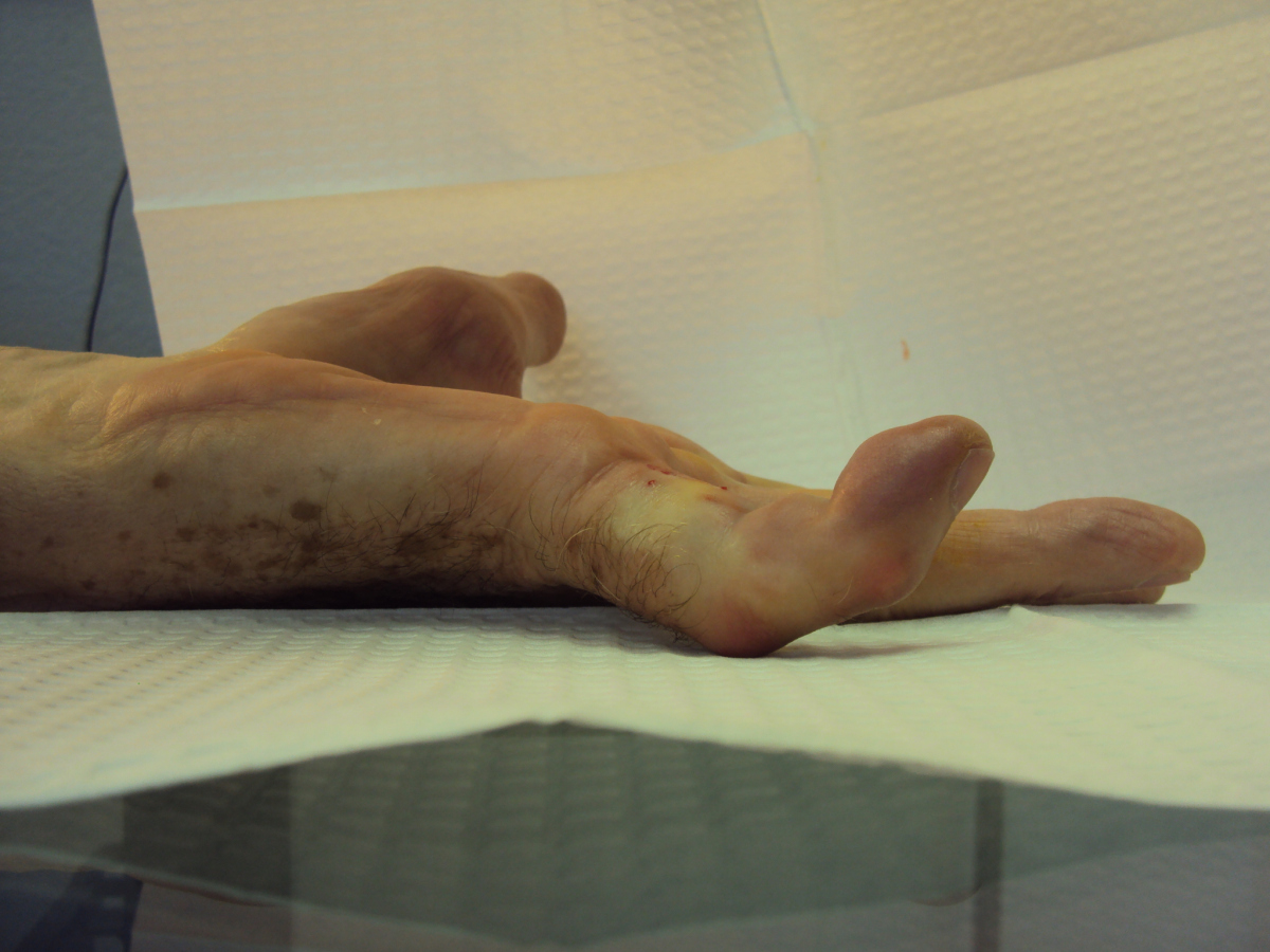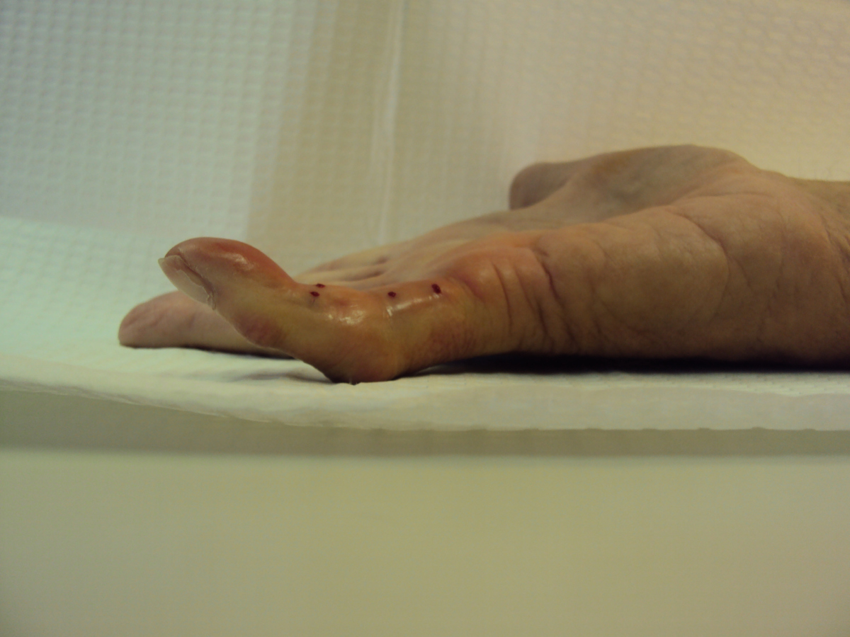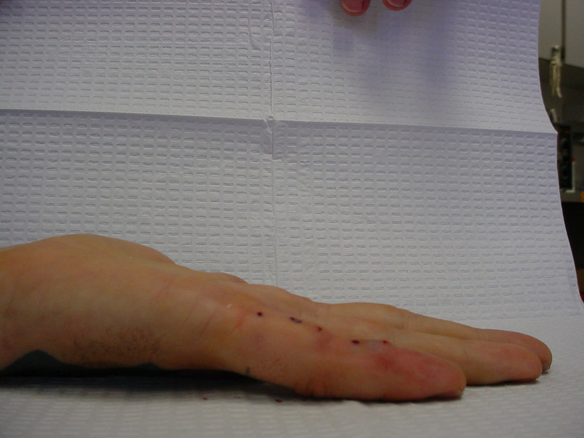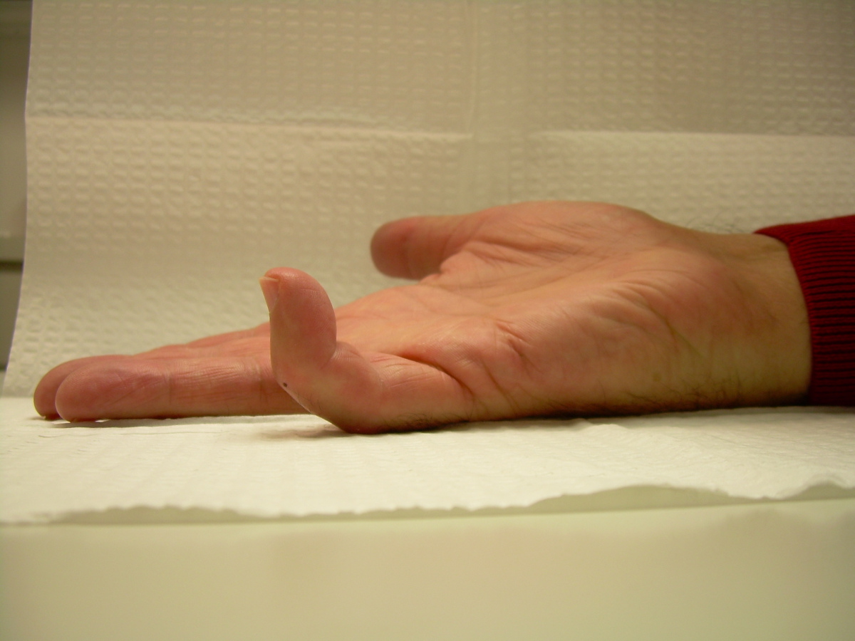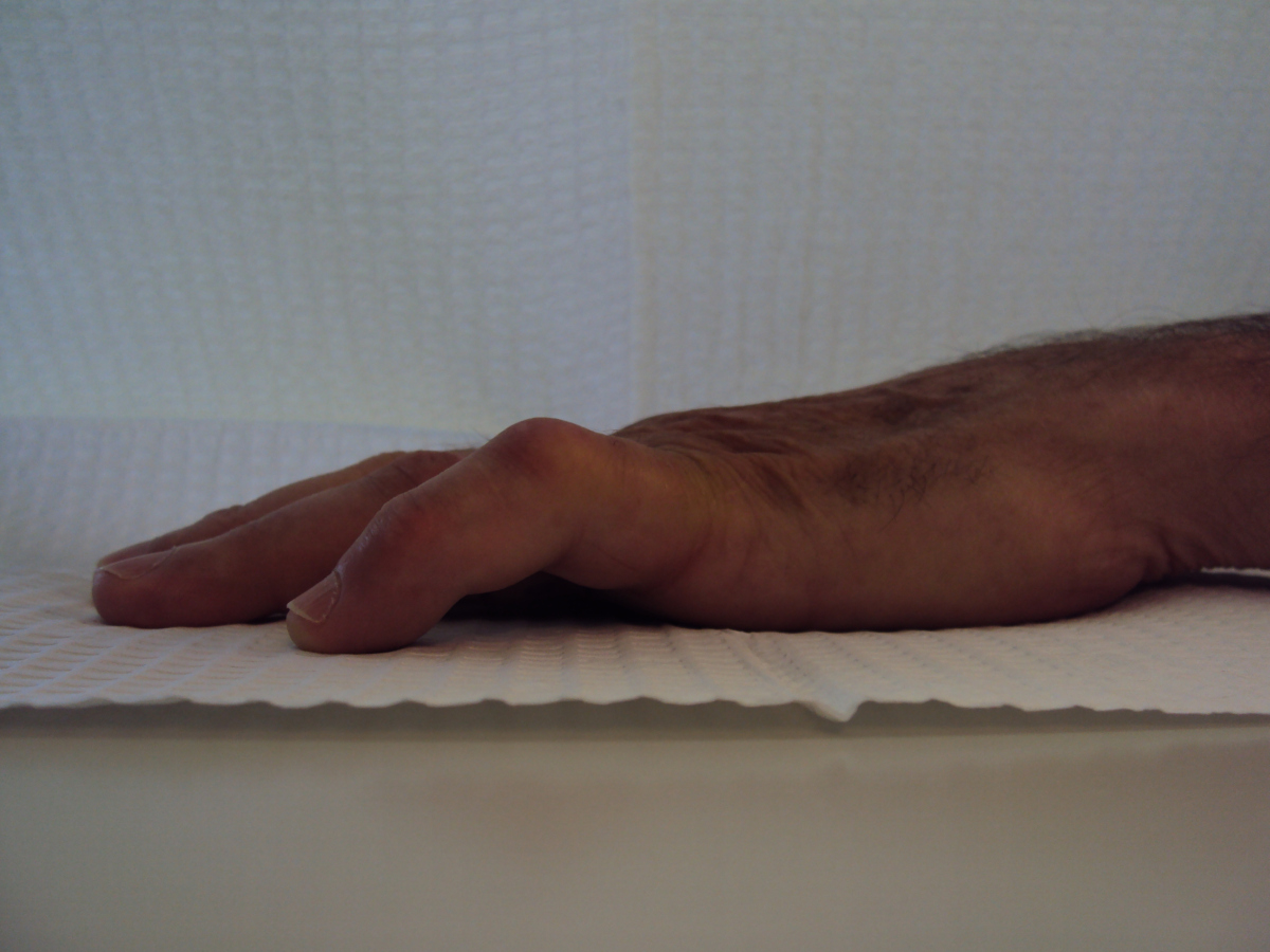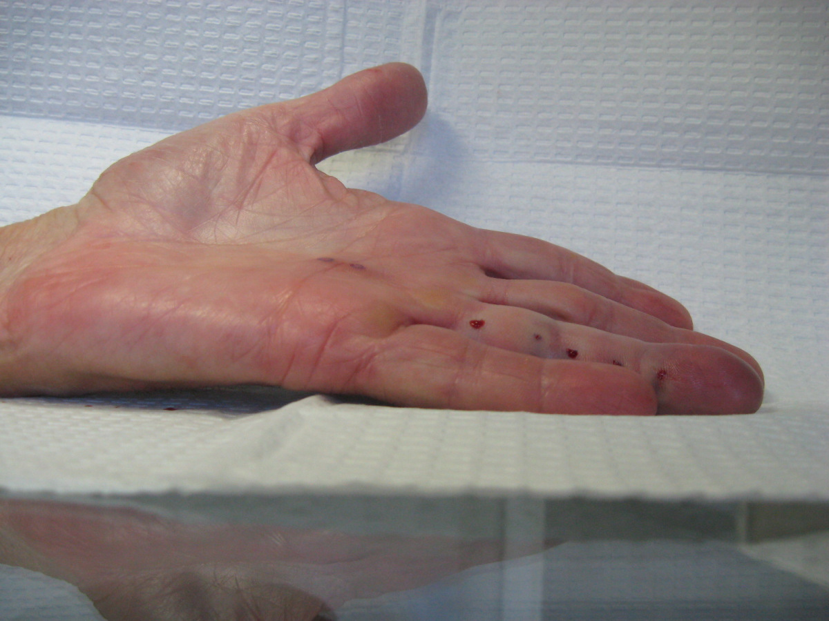 distal interphalangeal joint. The functional impact of this is that it contributes to the fingertip catching on things like a hook. Isolated interphalangeal joint contractures in the context of hyperextensible metacarpophalangeal joints allow patients to defer evaluation until the contracture is severe. The most common method of treating this is with fasciectomy, but needle fasciotomy may be effective. Collagenase has been used for this, but is an off-label application. As with needle release or collagenase treatment of the proximal interphalangeal joint, recurrence is expected: these minimal procedures should be considered a temporizing step with expectations of partial improvement. The following are examples of percutaneous needle fasciotomy for a variety of contractures involving the distal interphalangeal joint. Portals proximal and/or distal to the distal interphalangeal joint flexion creases are used, some bilaterally. These are presented to illustrate the diversity of even this subset of Dupuytren disease. None had prior treatment. Marking legend: . = Needle portals o = depot steroid injection x = portal planned, but not used. The technique is essentially the same as that for isolated PIP joint release, as shown here. |
