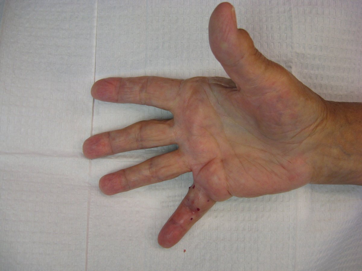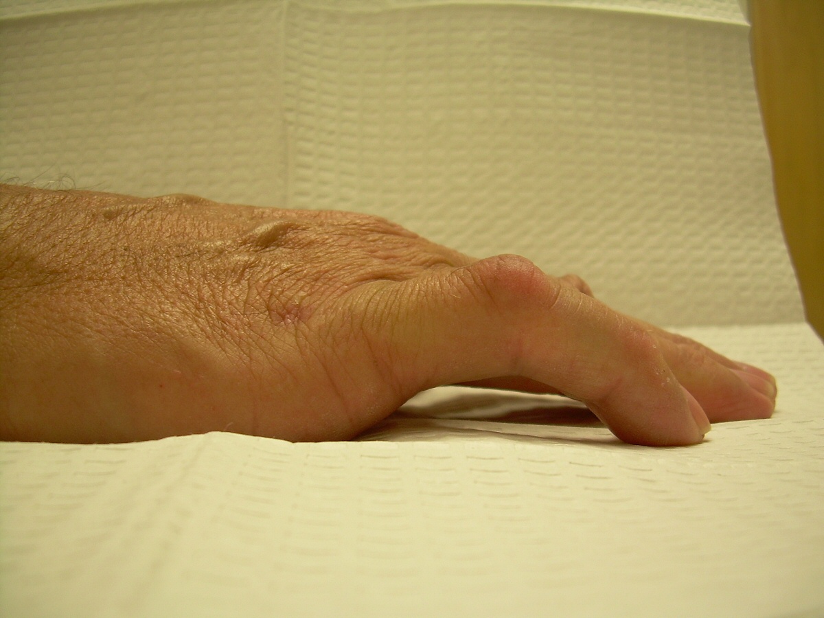 history of left small finger Dupuytren disease involving the proximal and distal interphalangeal joints. |