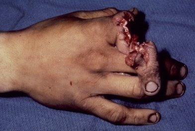 This index finger is technically salvageable with flaps and grafts of missing skin, bone, tendon, nerve and blood vessels. (Case of Dr. Graham Lister)