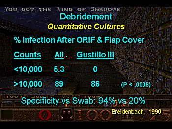 Significant bacterial contamination has been defined as greater than 100,000 bacteria per gram of tissue. However, high energy open fractures which require flap cover tolerate less. Quantitative tissue cultures are more reliable than swab in this context. If culture results from the time of flap closure are high, the flap may be re-elevated for redebridement at 48 hours. |