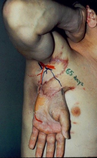 The hand was banked in the opposite axilla, arterial and vein repairs to the subscapular axis as shown. The hand joints were maintained mobile in therapy, and the wounds were allowed to heal at each site, closing the high risk window for operative complications, but within the window for nerve repair. |