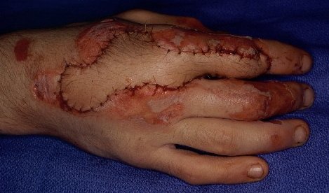Flap also covers a palmaris tendon graft reconstruction of the index extensor mechanism.