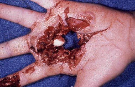 This through and through defect required separate dorsal and palmar closure (case of Dr. Graham Lister).