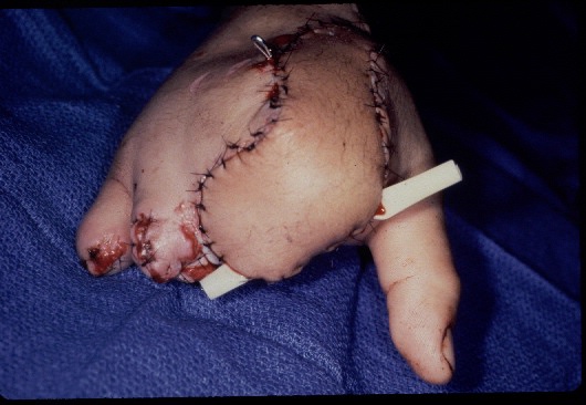 This lateral arm flap was innervated by repairing the superficial radial nerve to the lower lareral cutaneous nerve of the arm taken with the flap to provide a sensory contact area.